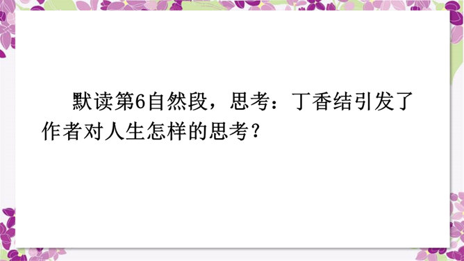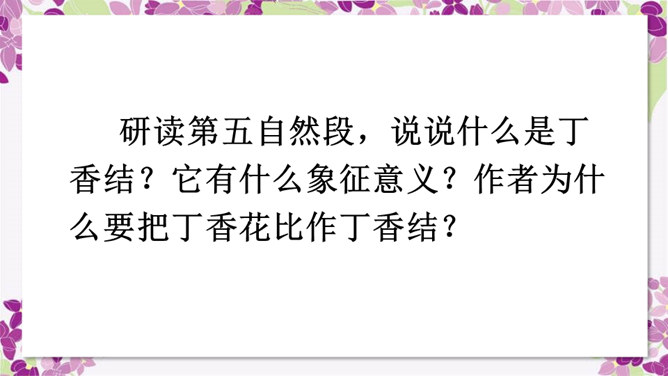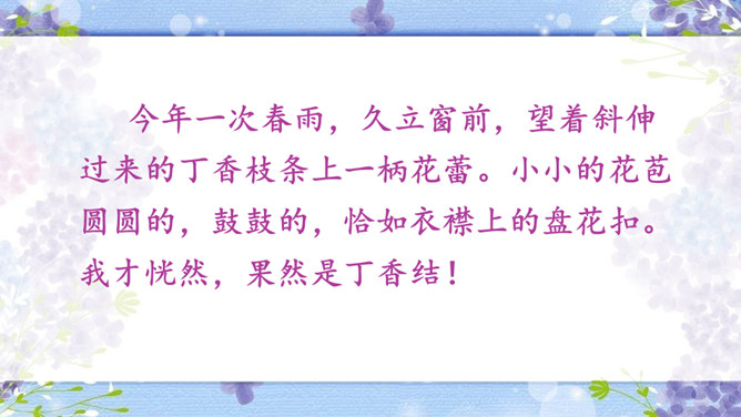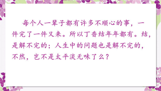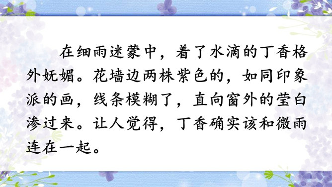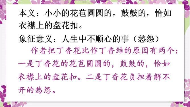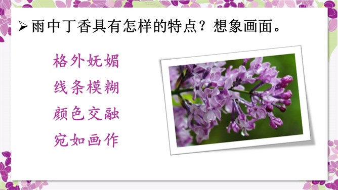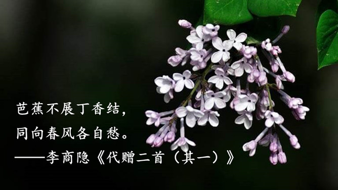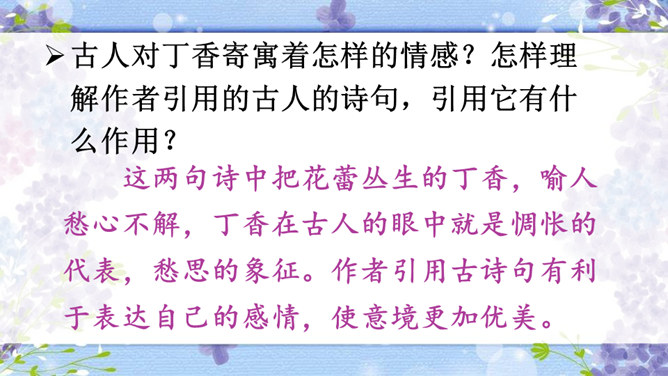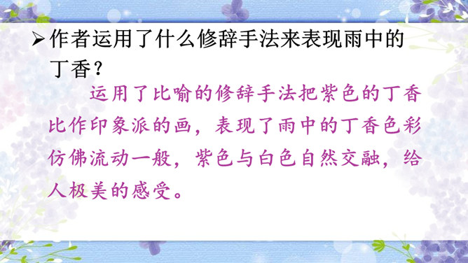 作者运用了什么修辞手法来表现雨中的丁香?运用了比喻的修辞手法把紫色的丁香比作印象派的画,表现了雨中的丁香色彩仿佛流动一般,紫色与白色自然交融,给人极美的感受。古人对丁香寄寓着怎样的情感?怎样理解作者引用的古人的诗句,引用它有什么作用?这两句诗中把花蕾丛生的丁香,喻人愁心不解,丁香在古人的眼中就是惆怅的代表,愁思的象征。作者引用古诗句有利于表达自己的感情,使意境更加优美。所属专题:丁香结ppt。