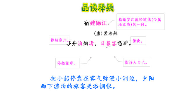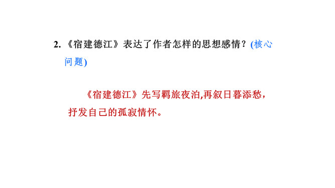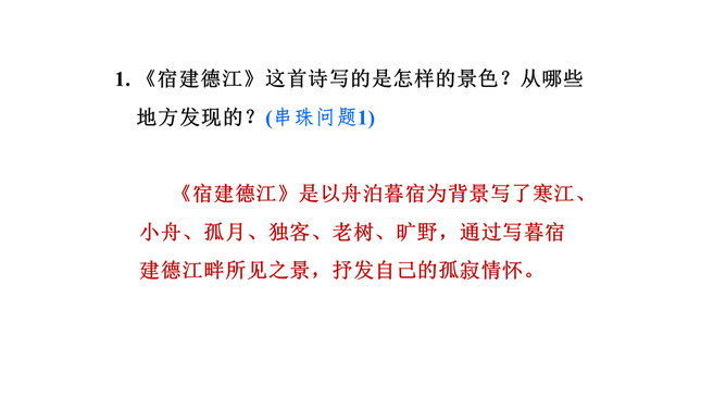 《宿建德江》这首诗写的是怎样的景色?从哪些地方发现的?(串珠问题1)以舟泊暮宿为背景写了寒江、小舟、孤月、独客、老树、旷野,通过写暮宿建德江畔所见之景,抒发自己的孤寂情怀。表达了作者怎样的思想感情?(核心问题)先写羁旅夜泊,再叙日暮添愁,抒发自己的孤寂情怀。诗人通过写暮宿建德江畔所见之景,抒发自己的孤寂情怀。全诗的艺术特色:此诗写羁旅愁思,情景相生,风韵天成,富有艺术美。所属专题:宿建德江ppt。