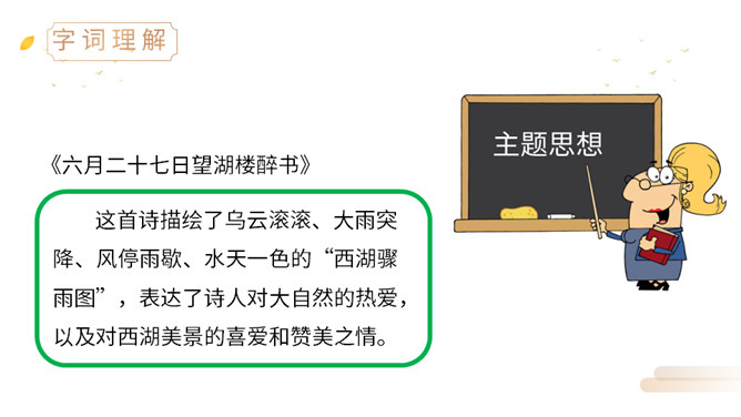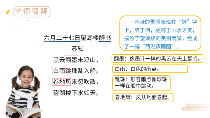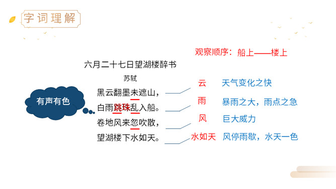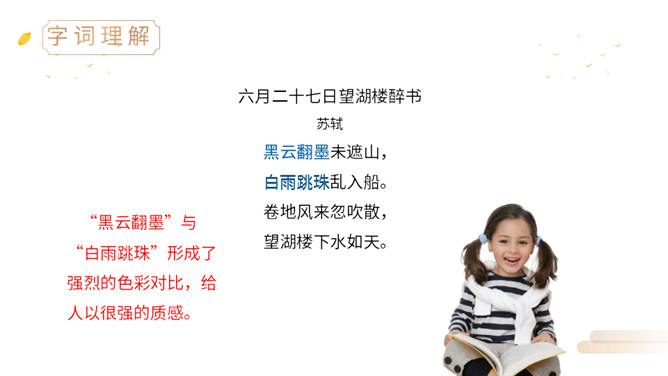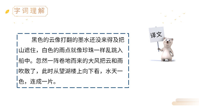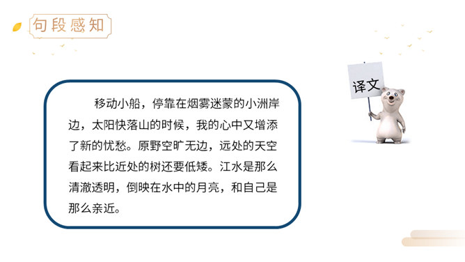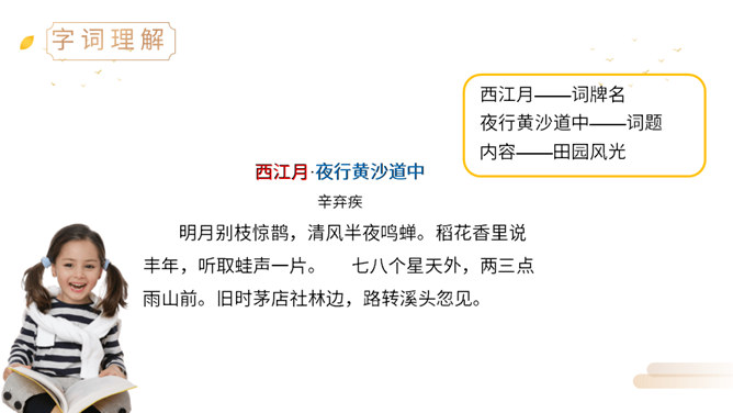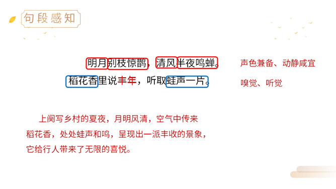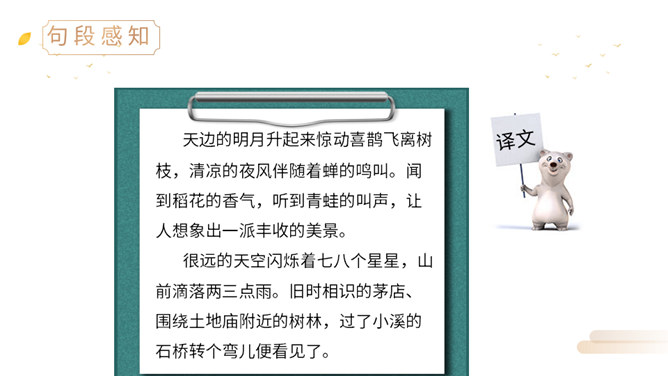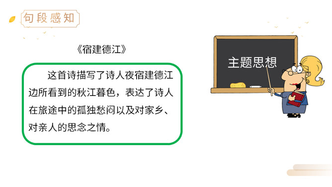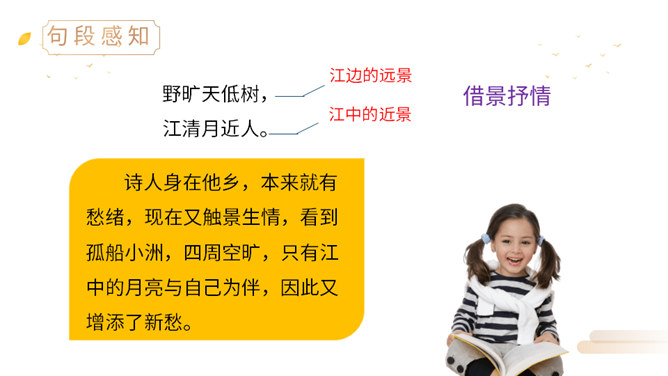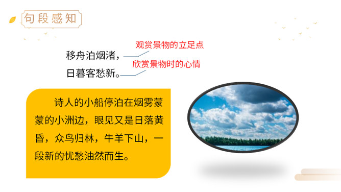 《宿建德江》《西江月·夜行黄沙道中》都写了月夜的景色,表达的感情却不一样,结合诗句说一说。《西江月·夜行黄沙道中》这首词里的“月”,是空中之“月”,描写的是在明月的照耀下,夜景中的一切是那么清晰可见、清新迷人,可以体会到诗人夜行的轻松、喜悦之情。而《宿建德江》这首诗里的“月”,是水中之“月”,它显得那么可望而不可即。结合第一、二句中的“日暮客愁新”,可以体会到诗人此时的孤独愁闷、思念家乡、思念亲人的心境。