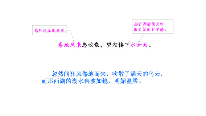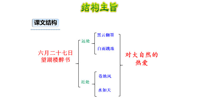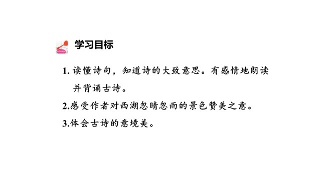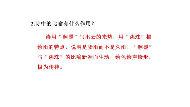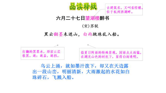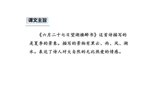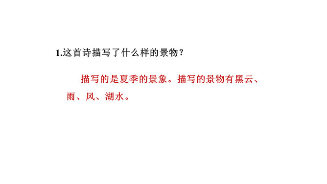 1. 读懂诗句,知道诗的大致意思。有感情地朗读并背诵古诗。2.感受作者对西湖忽晴忽雨的景色赞美之意。3.体会古诗的意境美。描写的是夏季的景象。描写的景物有黑云、雨、风、湖水。打翻的黑墨水,形容云层很黑。遮:遮盖,遮挡。诗中的比喻有什么作用?诗用“翻墨”写出云的来势,用“跳珠”描绘雨的特点,说明是骤雨而不是久雨。“翻墨”与“跳珠”的比喻新颖而生动,绘色绘声绘形,极为传神。所属专题:六月二十七日望湖楼醉书ppt。