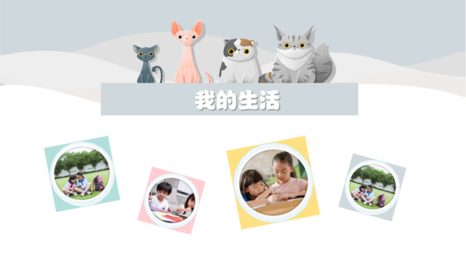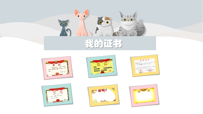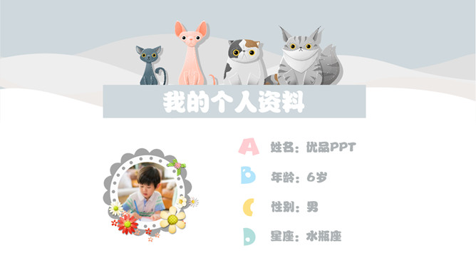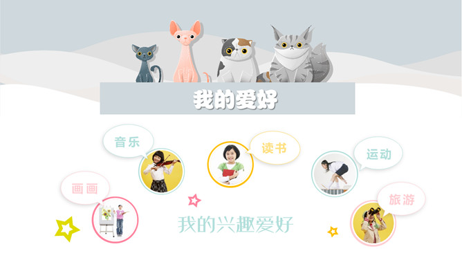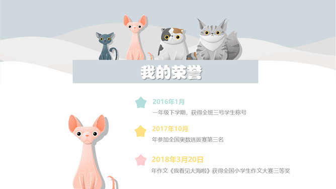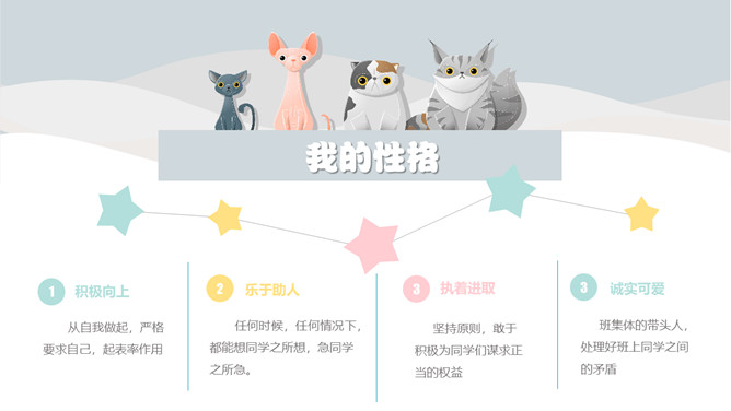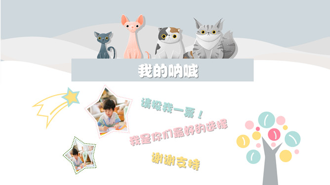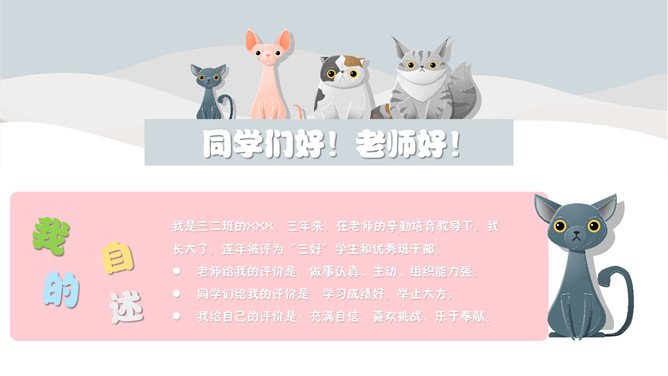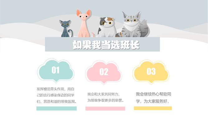 小学生卡通猫咪自我介绍PPT模板。一套小学生班干部竞选自我介绍幻灯片模板,可爱卡通猫咪元素设计,动态播放。