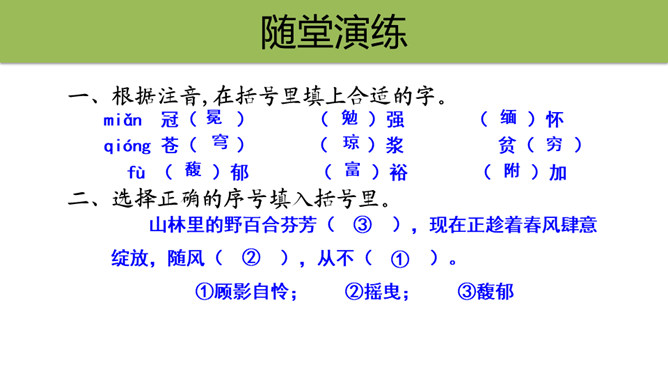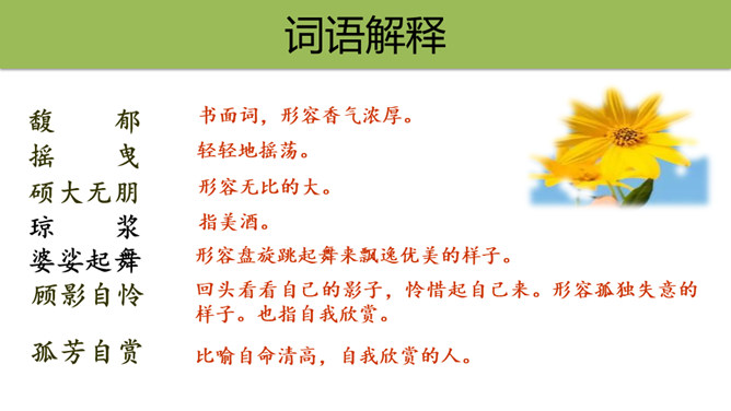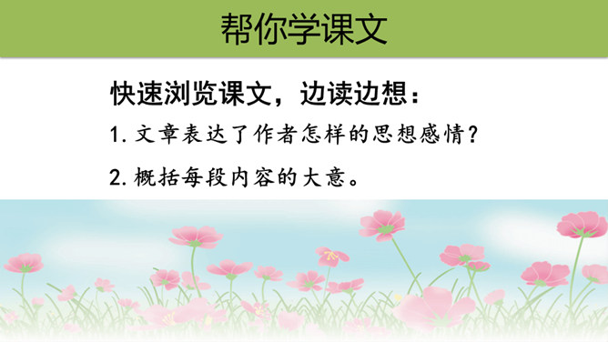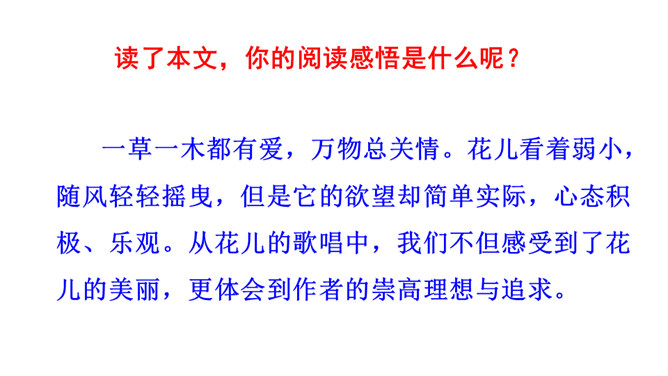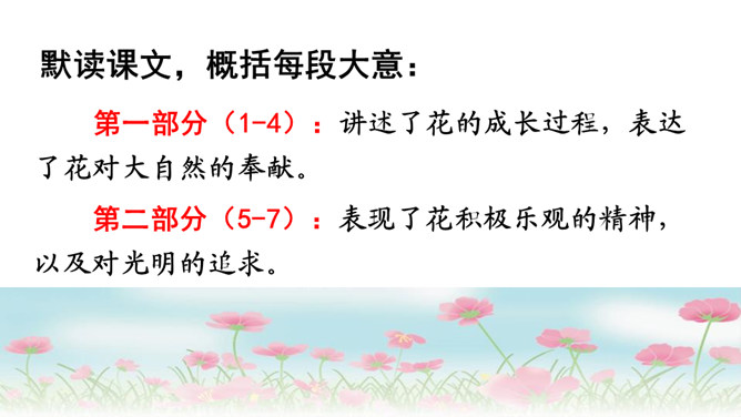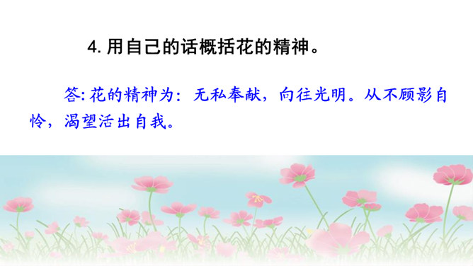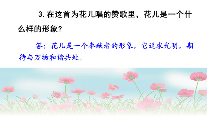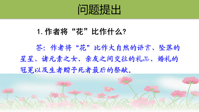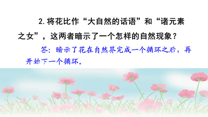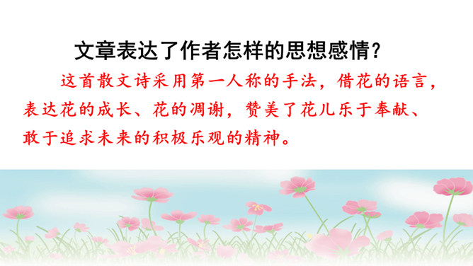文章表达了作者怎样的思想感情?这首散文诗采用第一人称的手法,借花的语言,表达花的成长、花的凋谢,赞美了花儿乐于奉献、敢于追求未来的积极乐观的精神。1.作者将“花”比作什么?答:作者将“花”比作大自然的语言、坠落的星星、诸元素之女、亲友之间交往的礼品、婚礼的冠冕以及生者赠予死者最后的祭献。2.将花比作“大自然的话语”和“诸元素之女”,这两者暗示了一个怎样的自然现象?所属专题:花之歌ppt。