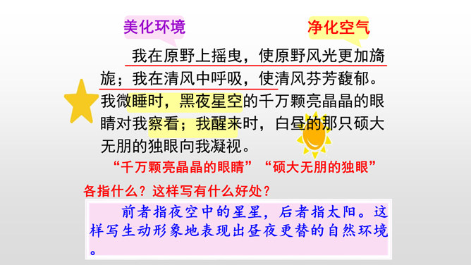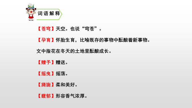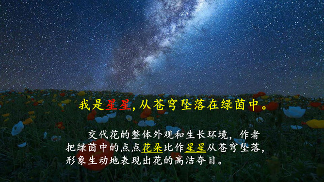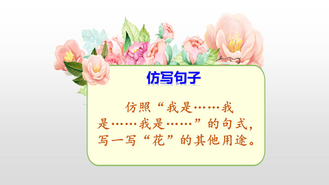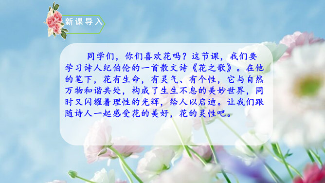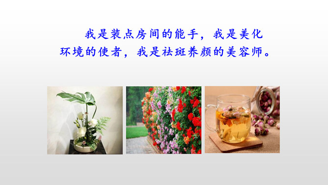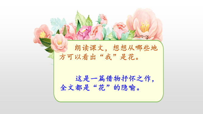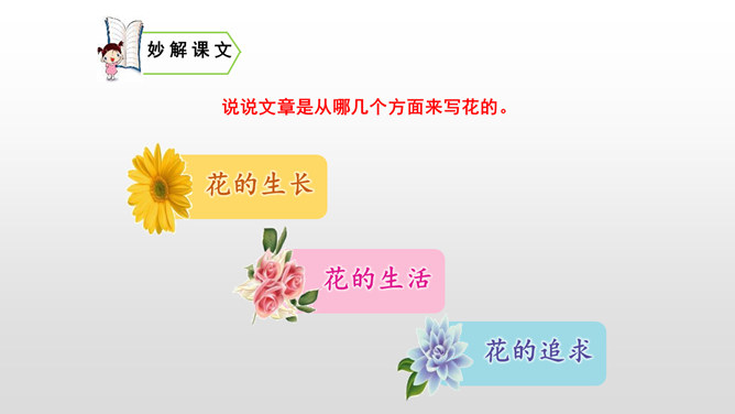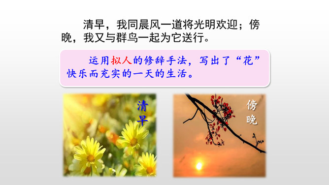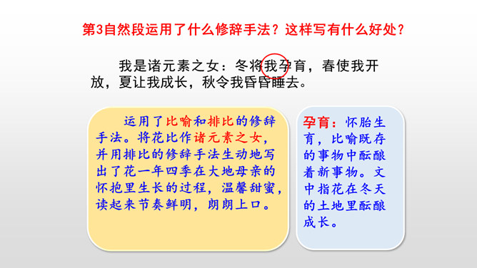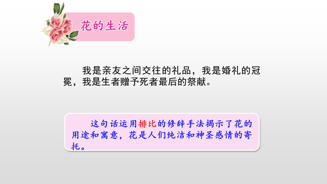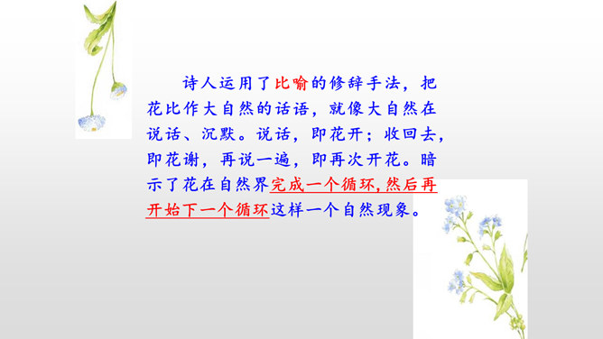 诗人运用了比喻的修辞手法,把花比作大自然的话语,就像大自然在说话、沉默。说话,即花开;收回去,即花谢,再说一遍,即再次开花。暗示了花在自然界完成一个循环,然后再开始下一个循环这样一个自然现象。运用了比喻和排比的修辞手法。将花比作诸元素之女,并用排比的修辞手法生动地写出了花一年四季在大地母亲的怀抱里生长的过程,温馨甜蜜,读起来节奏鲜明,朗朗上口。所属专题:花之歌ppt。