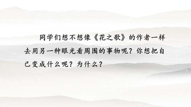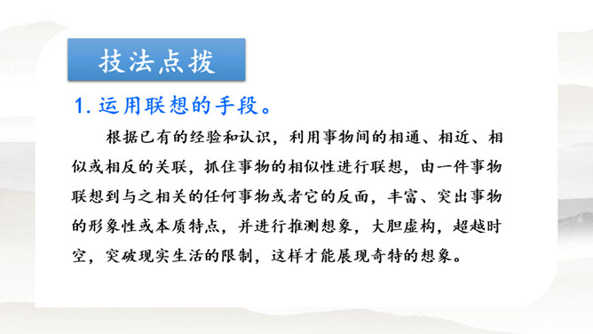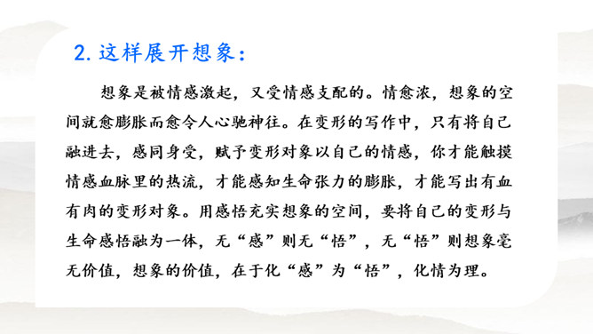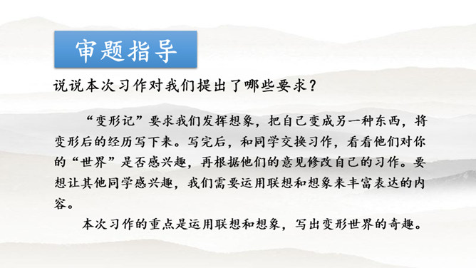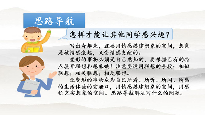 1.运用联想的手段。根据已有的经验和认识,利用事物间的相通、相近、相似或相反的关联,抓住事物的相似性进行联想,由一件事物联想到与之相关的任何事物或者它的反面,丰富、突出事物的形象性或本质特点,并进行推测想象,大胆虚构,超越时空,突破现实生活的限制,这样才能展现奇特的想象。2.这样展开想象:想象是被情感激起,又受情感支配的。情愈浓,想象的空间就愈膨胀而愈令人心驰神往。在变形的写作中,只有将自己融进去。所属专题:变形记ppt。