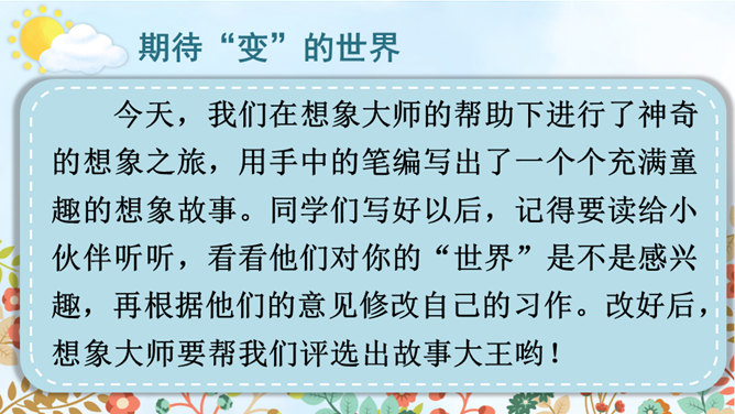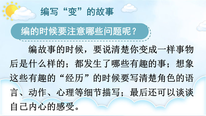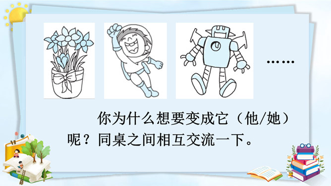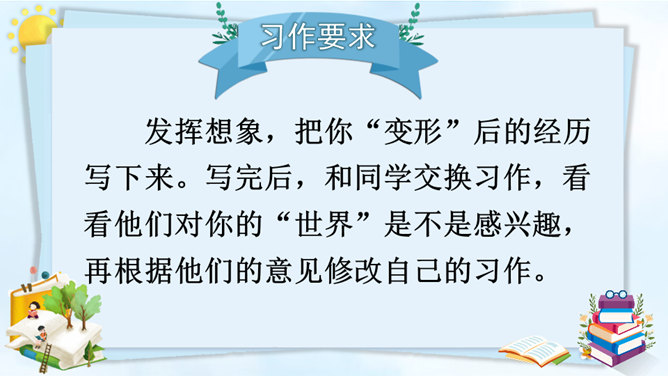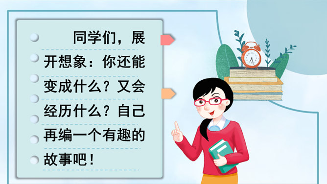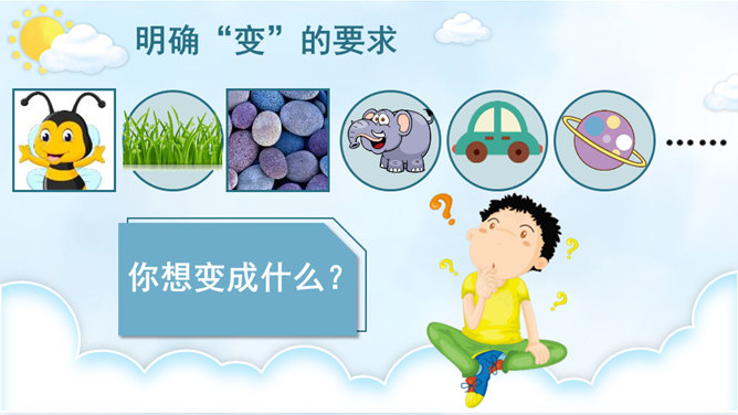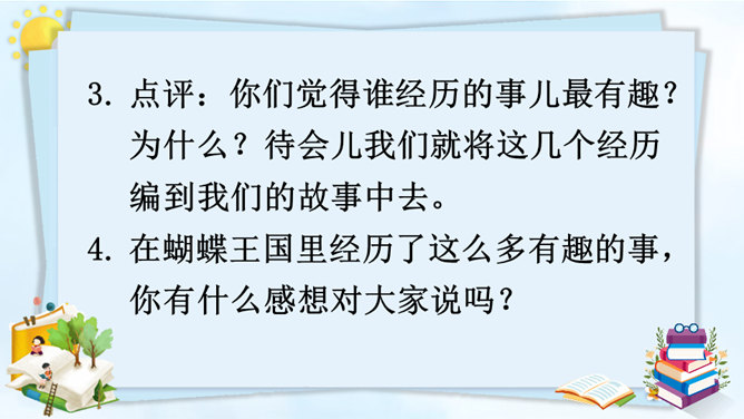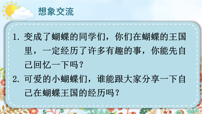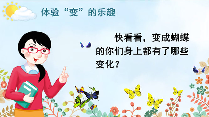 变成了蝴蝶的同学们,你们在蝴蝶的王国里,一定经历了许多有趣的事,你能先自己回忆一下吗?可爱的小蝴蝶们,谁能跟大家分享一下自己在蝴蝶王国的经历吗?点评:你们觉得谁经历的事儿最有趣?为什么?待会儿我们就将这几个经历编到我们的故事中去。在蝴蝶王国里经历了这么多有趣的事,你有什么感想对大家说吗?瞧,不知不觉中我们已经展开了想象的翅膀,编了一个非常有意思的故事,谁愿意将这个故事连起来说一说?所属专题:变形记ppt。