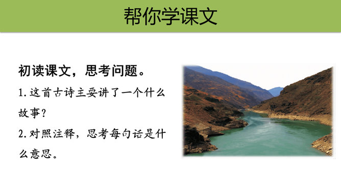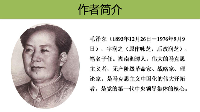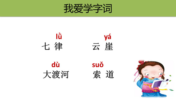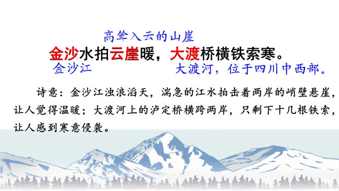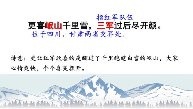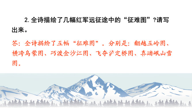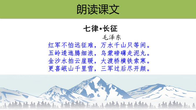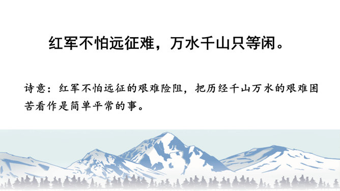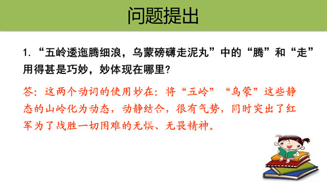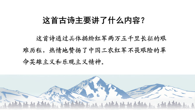 初读课文,思考问题。1.这首古诗主要讲了一个什么故事?2.对照注释,思考每句话是什么意思。这首古诗主要讲了什么内容?这首诗通过具体描绘红军两万五千里长征的艰难历程,热情地赞扬了中国工农红军不畏艰险的革命英雄主义和乐观主义精神。“五岭逶迤腾细浪,乌蒙磅礴走泥丸”中的“腾”和“走”用得甚是巧妙,妙体现在哪里?答:这两个动词的使用妙在:将“五岭”“乌蒙”这些静态的山岭化为动态,动静结合,很有气势,同时突出了红军为了战胜一切困难的无惧、无畏精神。所属专题:七律长征ppt。