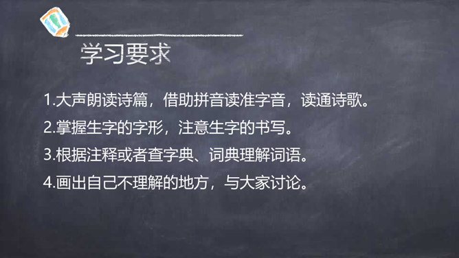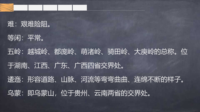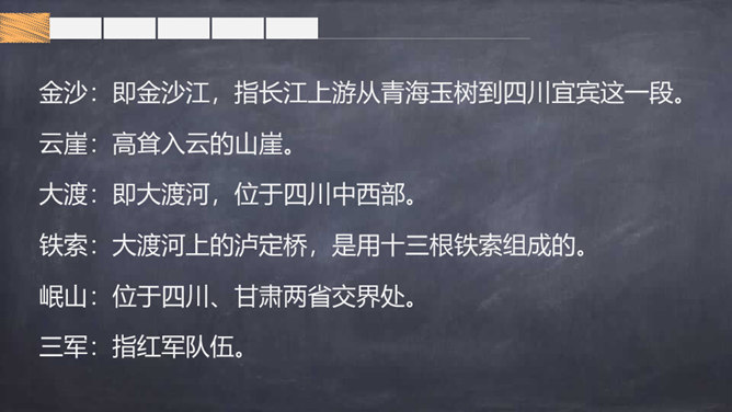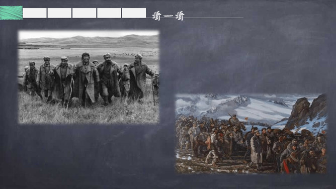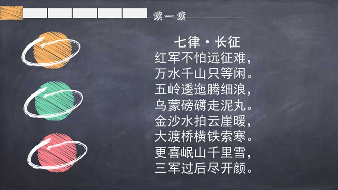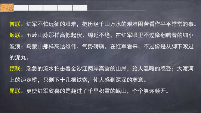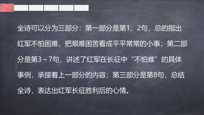 大声朗读诗篇,借助拼音读准字音,读通诗歌。掌握生字的字形,注意生字的书写。根据注释或者查字典、词典理解词语。画出自己不理解的地方,与大家讨论。想一想每联的意思是什么。全诗可以分为三部分:第一部分是第1、2句,总的指出红军不怕困难,把艰难困苦看成平平常常的小事;第二部分是第3~7句,讲述了红军在长征中“不怕难”的具体事例,承接着上一部分的内容;第三部分是第8句,总结全诗,表达出红军长征胜利后的心情。所属专题:七律长征ppt。