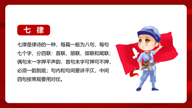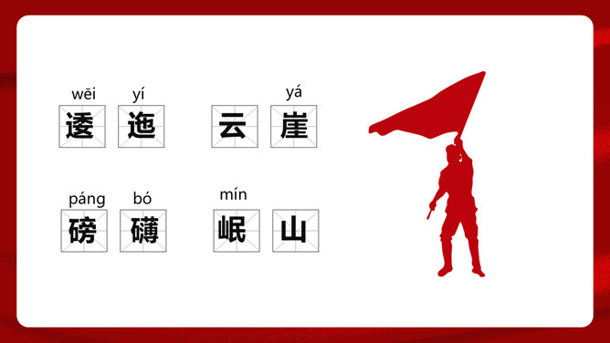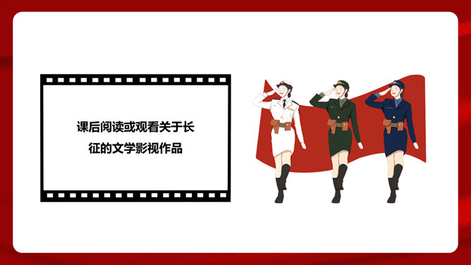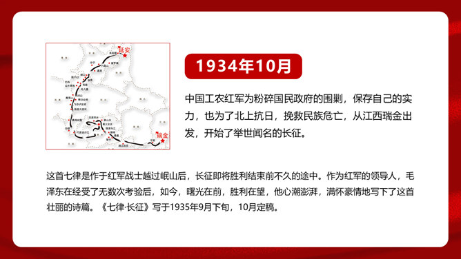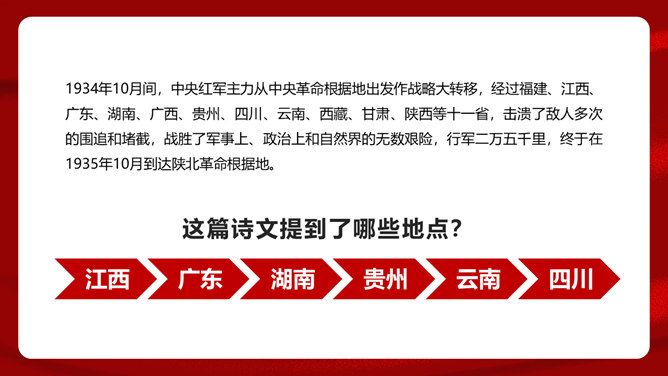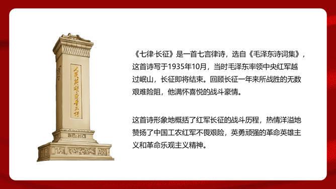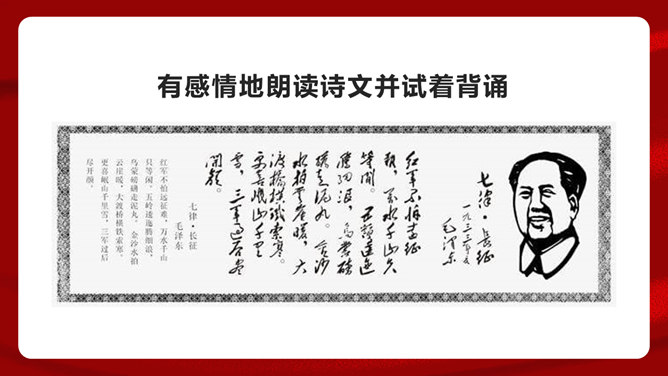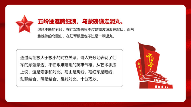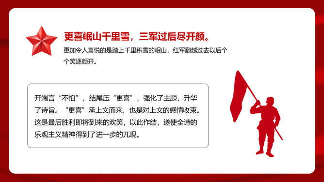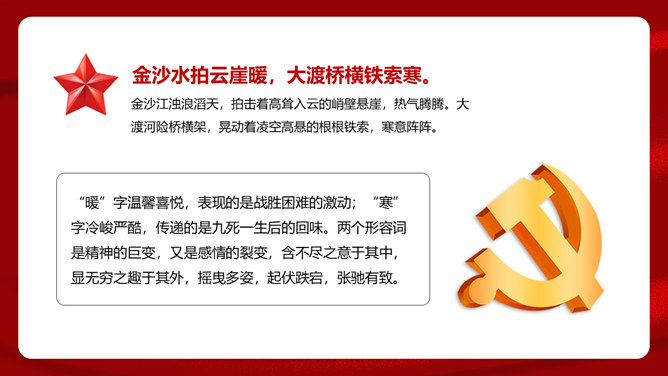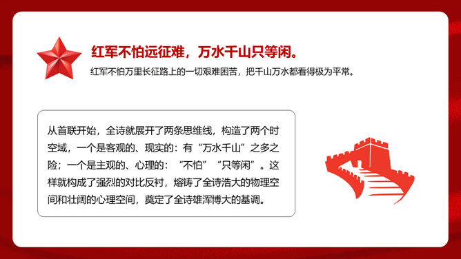 首联开始,全诗就展开了两条思维线,构造了两个时空域,一个是客观的、现实的:有“万水千山”之多之险;一个是主观的、心理的:“不怕”“只等闲”。这样就构成了强烈的对比反衬,熔铸了全诗浩大的物理空间和壮阔的心理空间,奠定了全诗雄浑博大的基调。通过两组极大于极小的对立关系,诗人充分地表现了红军的顽强豪迈、不怕艰难险阻的英雄气概。从艺术手法上说,这是夸张和对比。写山是明线,写红军是暗线,动静结合,明暗结合,反衬对比,十分巧妙。“暖”字温馨喜悦,表现的是战胜困难的激动;“寒”字冷峻严酷,传递的是九死一生后的回味。两个形容词是精神的巨变,又是感情的裂变,含不尽之意于其中。所属专题:七律长征ppt。