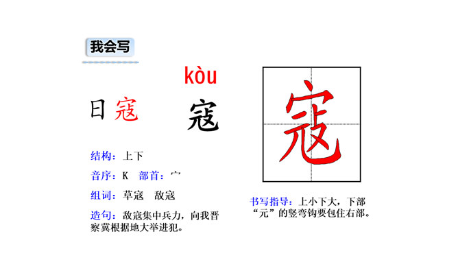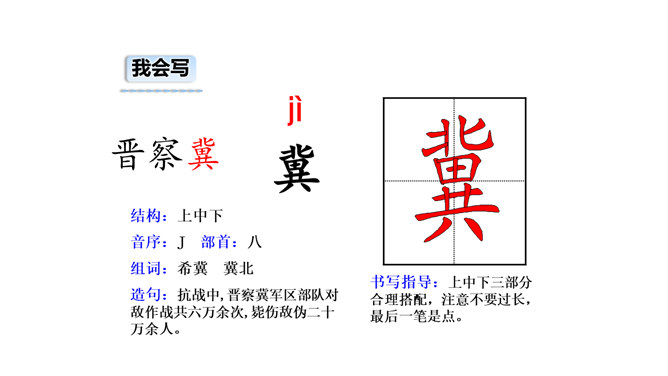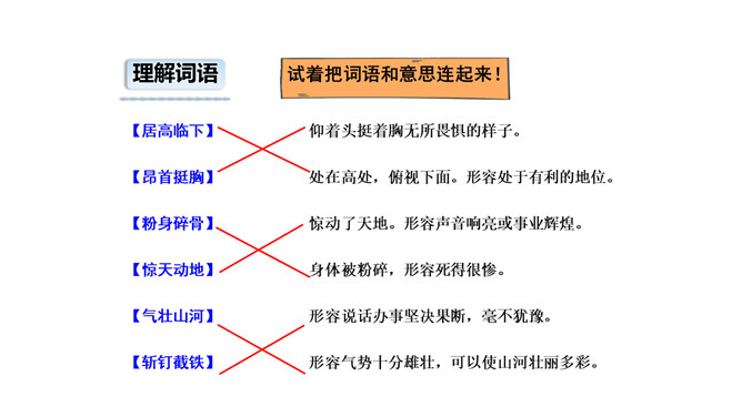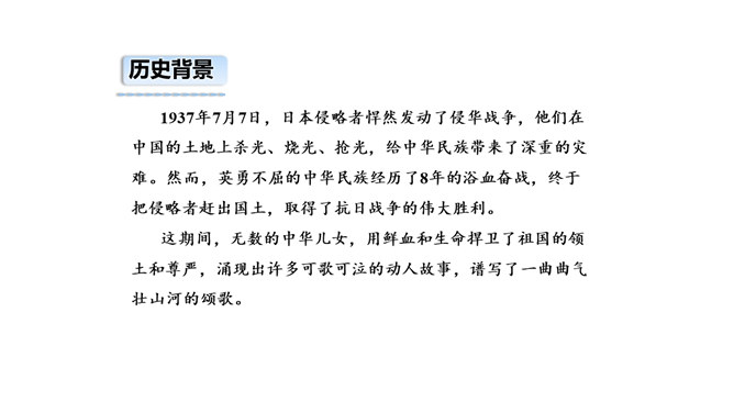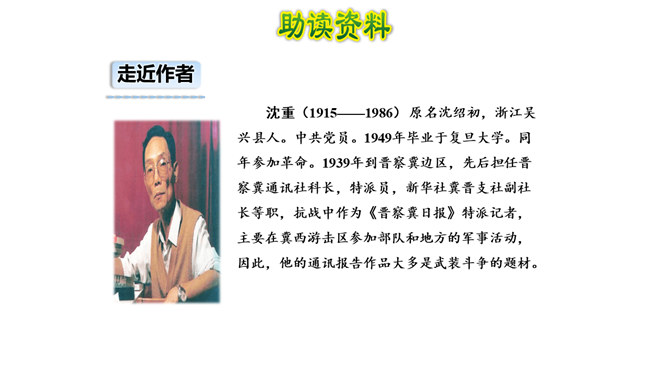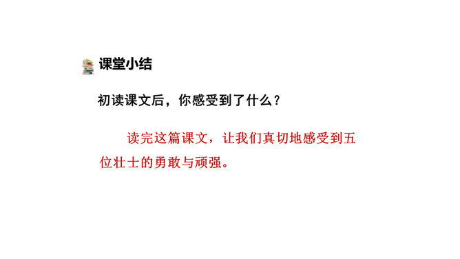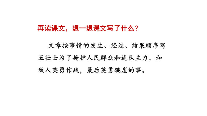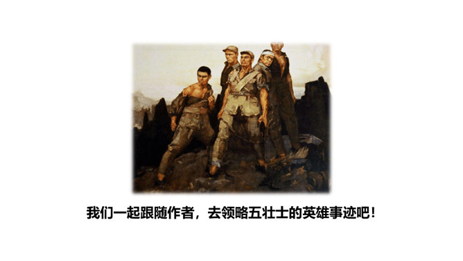 我们一起跟随作者,去领略五壮士的英雄事迹吧!学习目标:1.会写16个生字,理解生字组成的词语。 (重点)2.初步感知文意,了解课文内容。(难点)再读课文,想一想课文写了什么?文章按事情的发生、经过、结果顺序写五壮士为了掩护人民群众和连队主力,和敌人英勇作战,最后英勇跳崖的事。初读课文后,你感受到了什么?读完这篇课文,让我们真切地感受到五位壮士的勇敢与顽强。所属专题:狼牙山五壮士ppt。
