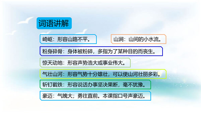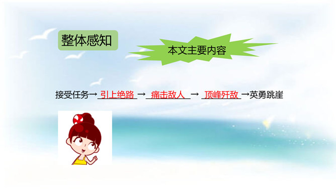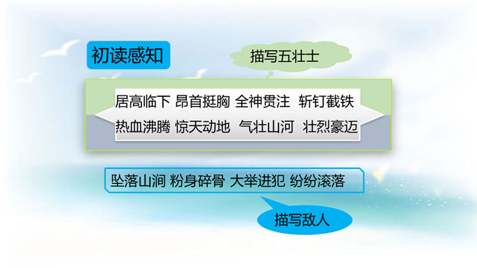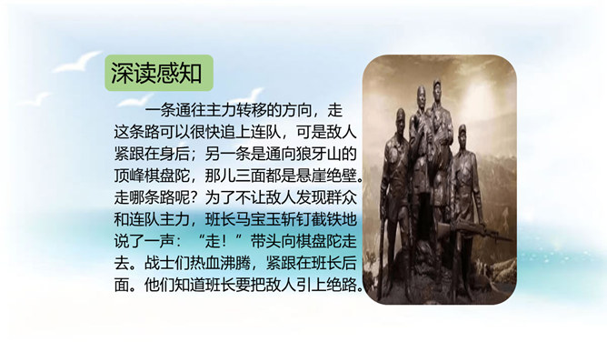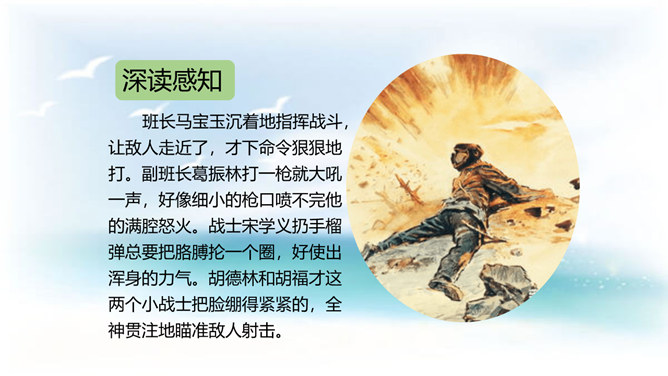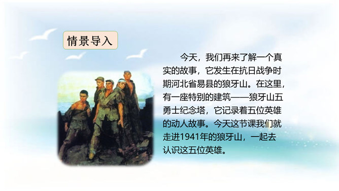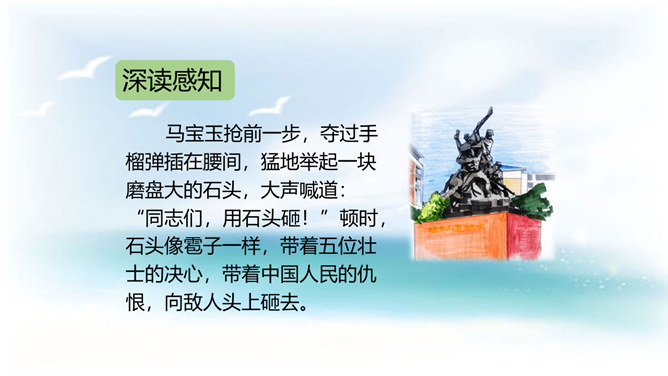 今天,我们再来了解一个真实的故事,它发生在抗日战争时期河北省易县的狼牙山。在这里,有一座特别的建筑——狼牙山五勇士纪念塔,它记录着五位英雄的动人故事。今天这节课我们就走进1941年的狼牙山,一起去认识这五位英雄。体会战士们毫不畏惧的英雄气概。石头像冰雹一样,说明了数量多,速度快,力量大呀!这更写出了战士们的英勇顽强啊!写出了他们对敌人的仇恨。所属专题:狼牙山五壮士ppt。