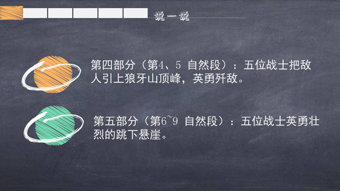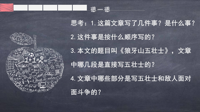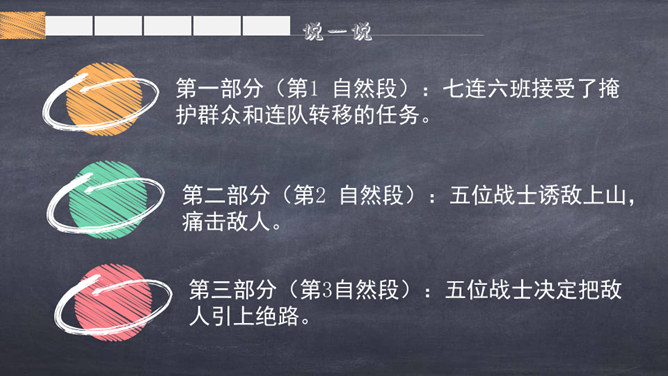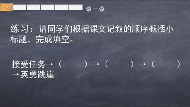 1.自由朗读课文,借助拼音读准字音,扫清生字障碍,把课文读通顺。2.掌握字形,规范书写,注重积累。3.联系上下文或查字典、词典理解词语。4.标出自然段序号,把不理解的语句标出来,与大家讨论。思考:1.这篇文章写了几件事?是什么事?2.这件事是按什么顺序写的?3.文章中哪些部分是写五壮士和敌人面对面斗争的?思考:根据刚才的分析,想一想课文分为几个部分及每部分的意思,用简要的语言说一说。所属专题:狼牙山五壮士ppt。
