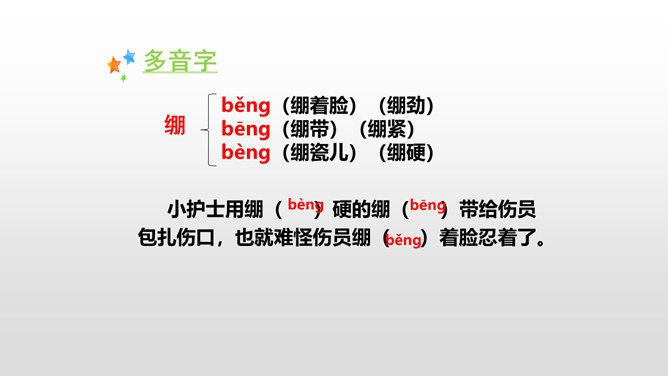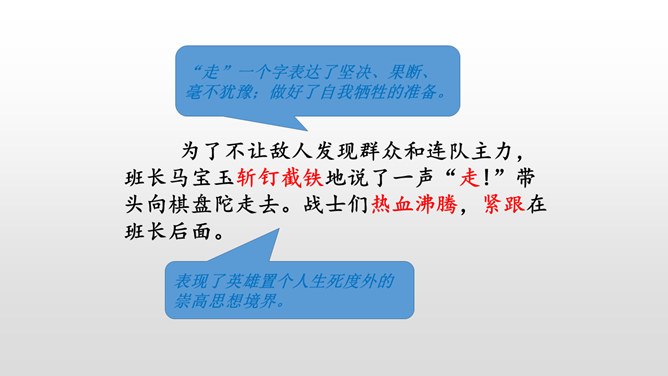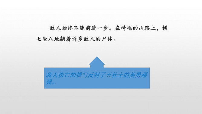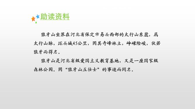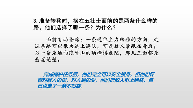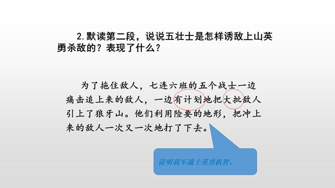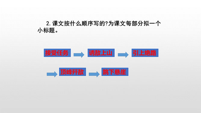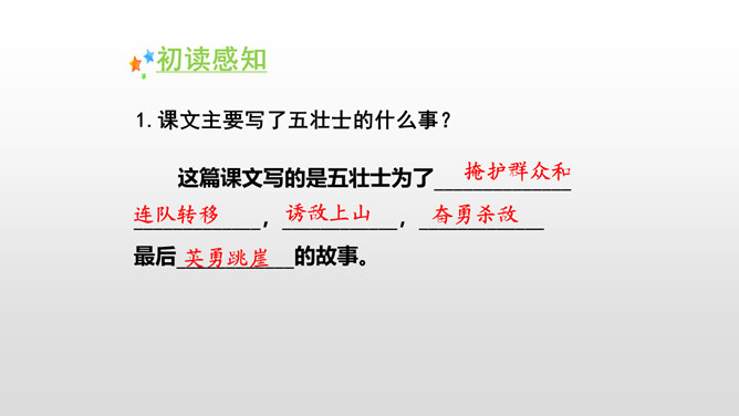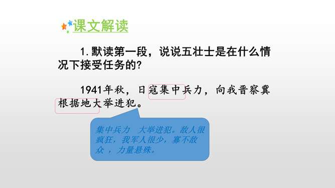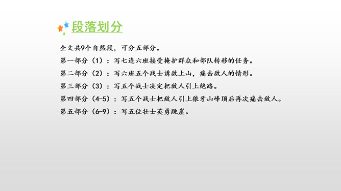 全文共9个自然段,可分五部分。第一部分(1):写七连六班接受掩护群众和部队转移的任务。第二部分(2):写六班五个战士诱敌上山,痛击敌人的情形。第三部分(3):写五个战士决定把敌人引上绝路。第四部分(4-5):写五个战士把敌人引上狼牙山峰顶后再次痛击敌人。第五部分(6-9):写五位壮士英勇跳崖。默读第一段,说说五壮士是在什么情况下接受任务的? 默读第二段,说说五壮士是怎样诱敌上山英勇杀敌的?表现了什么?所属专题:狼牙山五壮士ppt。