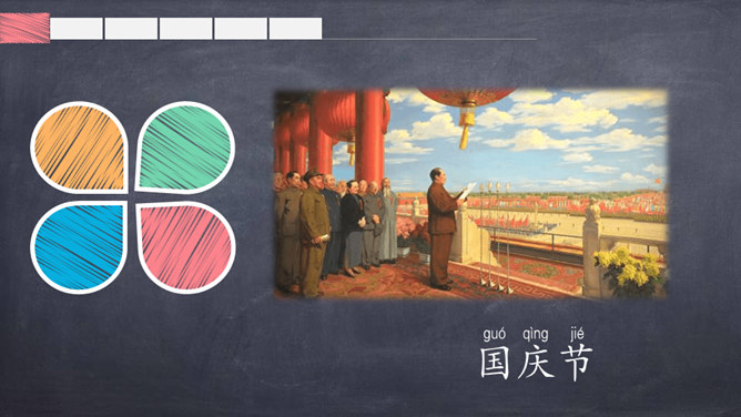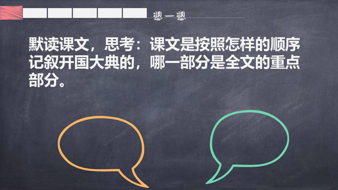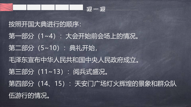 默读课文,思考:课文是按照怎样的顺序记叙开国大典的,哪一部分是全文的重点部分。1.自由朗读课文,借助拼音读准字音,不熟悉的字多拼读几遍。2.借助字典掌握生字的字形,注意字的书写。3.联系上下文或查字典、词典理解词语。4.标出自然段序号,把自己不理解的地方画出来,与大家讨论。读课文,想一想课文中的哪些场面给你留下了深刻的印象,说一说原因。出文中的新词语,写在摘抄本上,积累词语。所属专题:开国大典ppt。