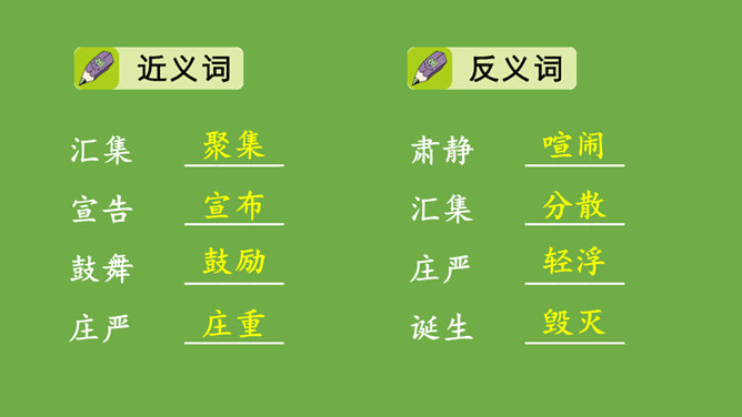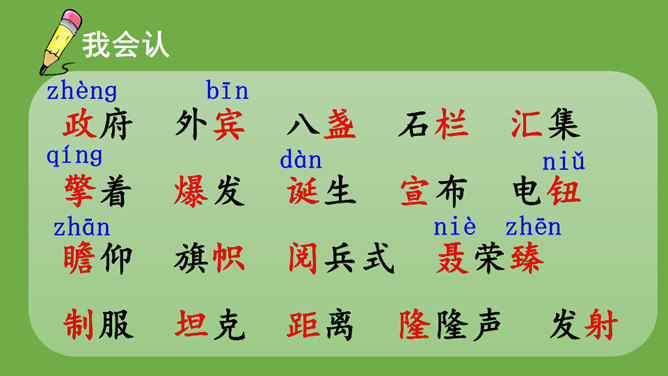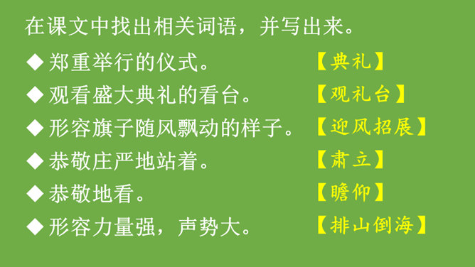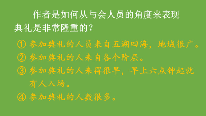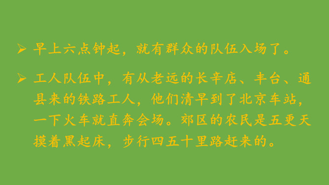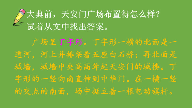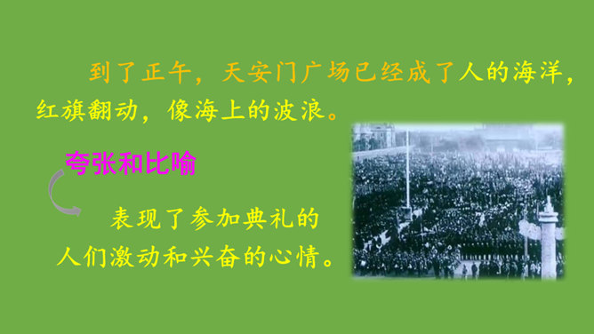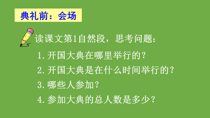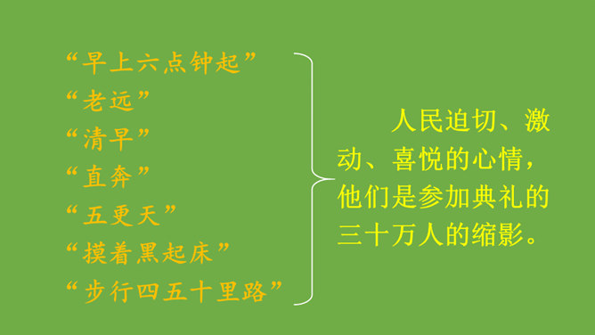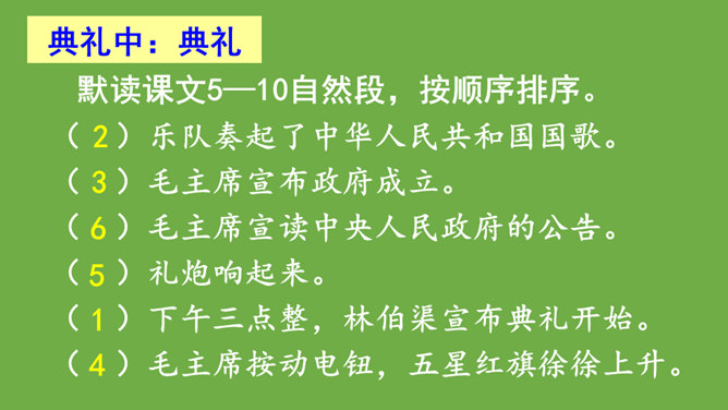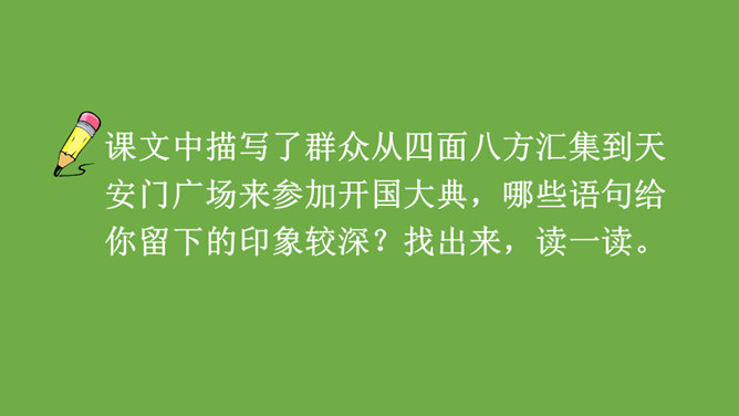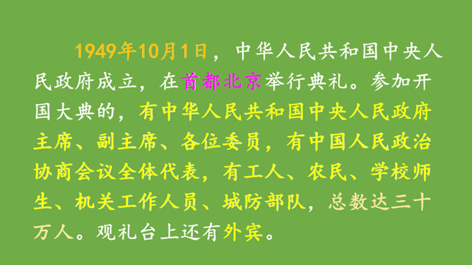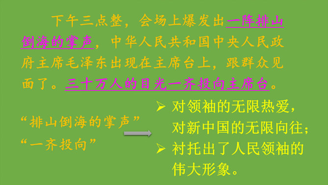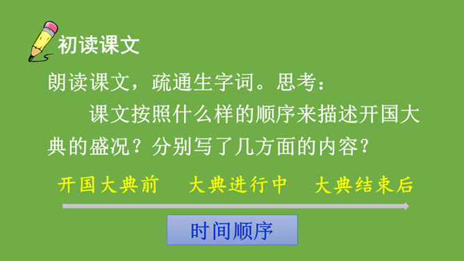 本文记叙了开国大典的盛况,表达了中国人民对新中国诞生的无比自豪、激动的心情。默读时,要注意做到:心到、眼到、手到。可以画出重点词句,或标出段落中的层次,记下自己不懂的问题,提高默读效率。本文是按时间顺序和开国大典进行的顺序记叙的。先写大会开始前会场上的情况,然后写典礼的重要环节——奏国歌、毛泽东同志宣布中华人民共和国中央人民政府成立、升国旗、宣读中央人民政府公告,接着讲阅兵式的盛况,最后讲群众游行。所属专题:开国大典ppt。