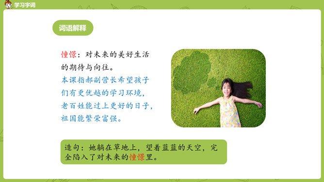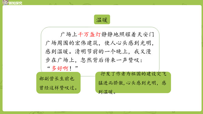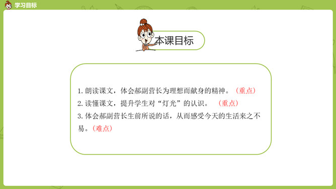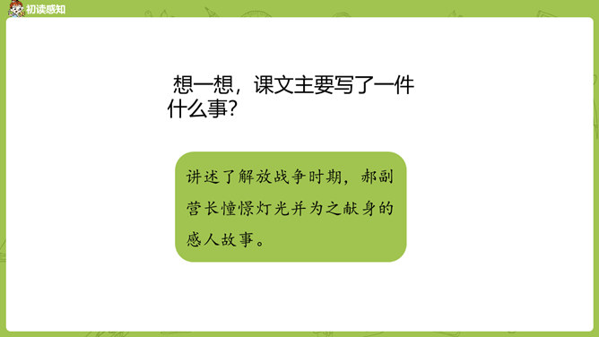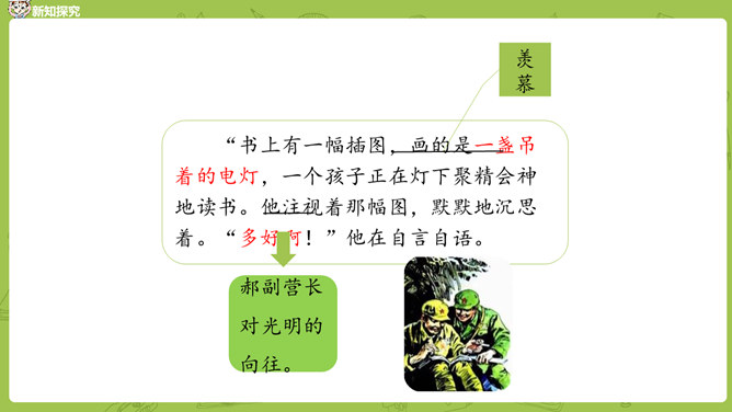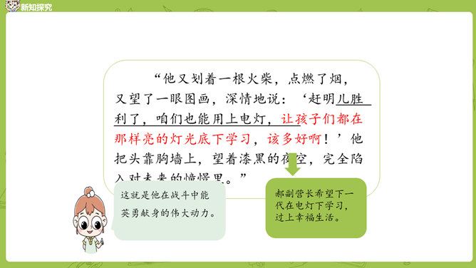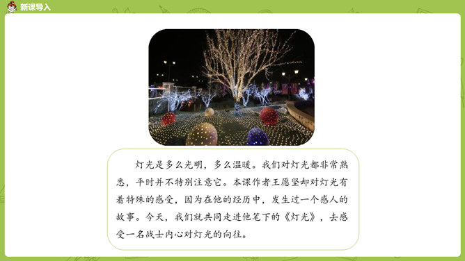 1.朗读课文,体会郝副营长为理想而献身的精神。 (重点)2.读懂课文,提升学生对“灯光”的认识。 (重点)3.体会郝副营长生前所说的话,从而感受今天的生活来之不易。(难点)灯光是多么光明,多么温暖。我们对灯光都非常熟悉,平时并不特别注意它。本课作者王愿坚却对灯光有着特殊的感受,因为在他的经历中,发生过一个感人的故事。今天,我们就共同走进他笔下的《灯光》,去感受一名战士内心对灯光的向往。所属专题:灯光ppt。