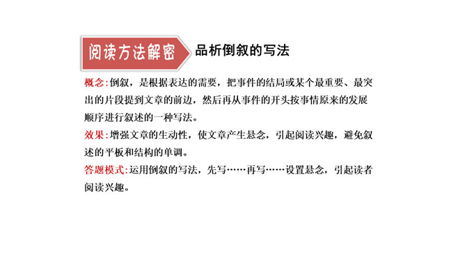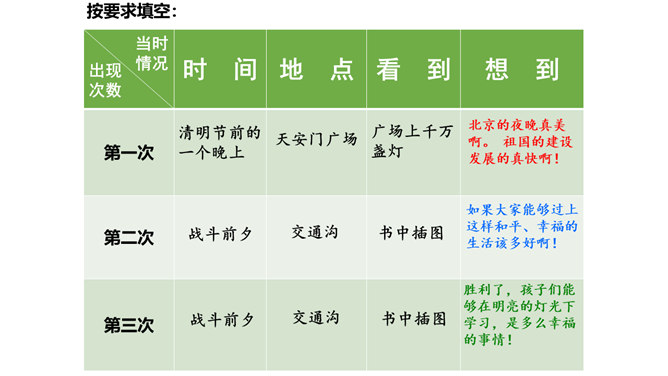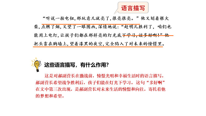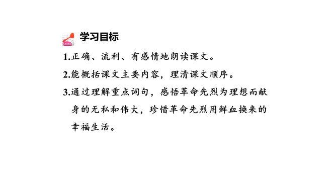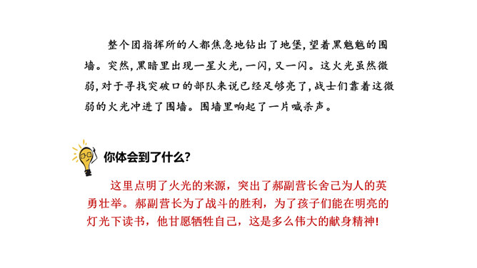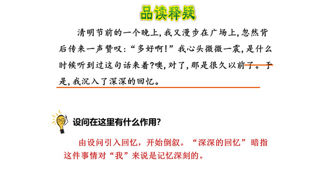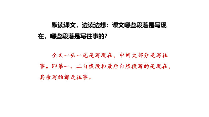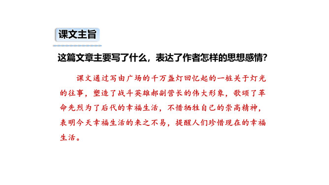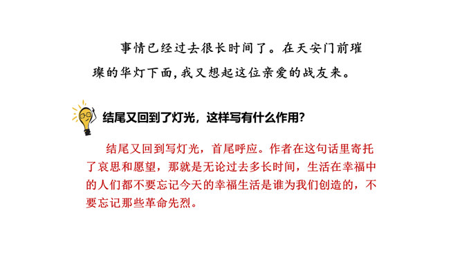 1.正确、流利、有感情地朗读课文。2.能概括课文主要内容,理清课文顺序。3.通过理解重点词句,感悟革命先烈为理想而献身的无私和伟大,珍惜革命先烈用鲜血换来的幸福生活。默读课文,边读边想:课文哪些段落是写现在,哪些段落是写往事的?全文一头一尾是写现在,中间大部分是写往事。即第一、二自然段和最后自然段写的是现在,其余写的都是往事。由设问引入回忆,开始倒叙。 “深深的回忆” 暗指这件事情对“我”来说是记忆深刻的。所属专题:灯光ppt。