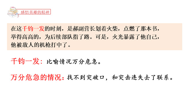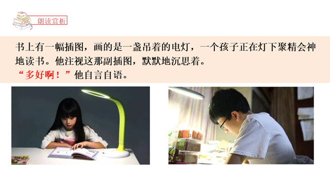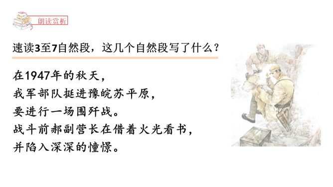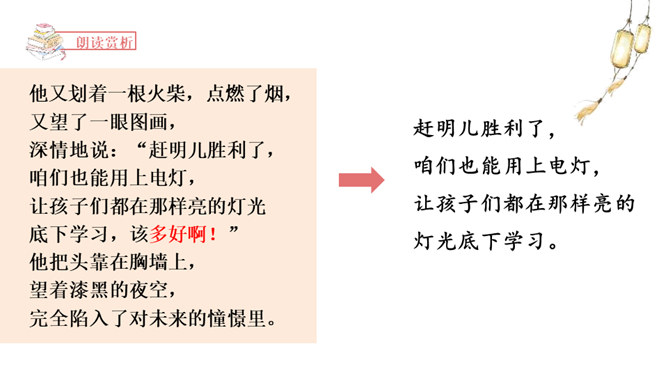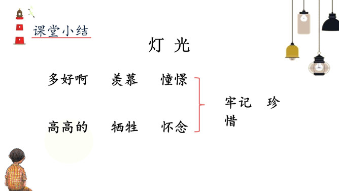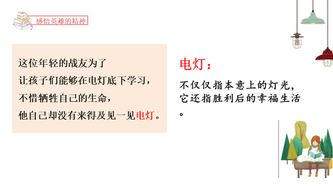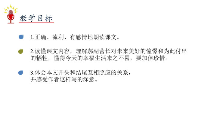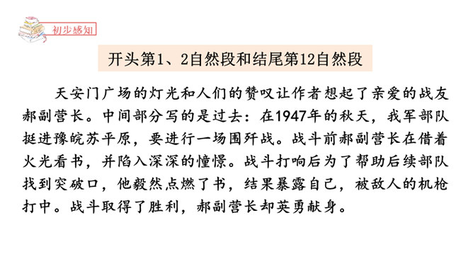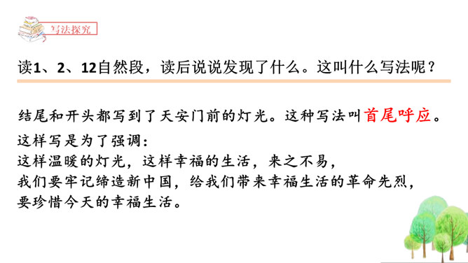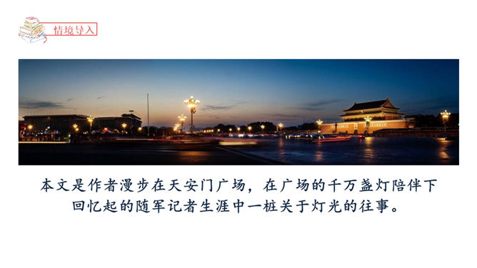 1.正确、流利、有感情地朗读课文。2.读懂课文内容,理解郝副营长对未来美好的憧憬和为此付出的牺牲,懂得今天的幸福生活来之不易,要加倍珍惜。3.体会本文开头和结尾互相照应的关系,并感受作者这样写的深意。本文是作者漫步在天安门广场,在广场的千万盏灯陪伴下回忆起的随军记者生涯中一桩关于灯光的往事。结尾和开头都写到了天安门前的灯光。这种写法叫首尾呼应。所属专题:灯光ppt。