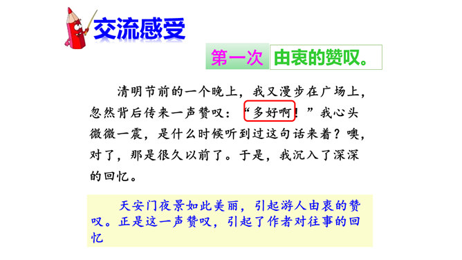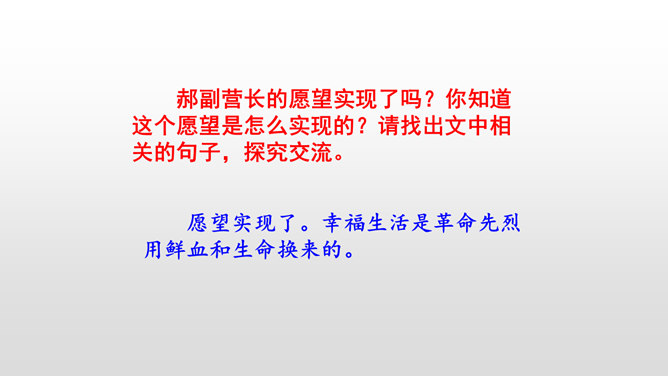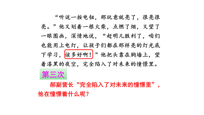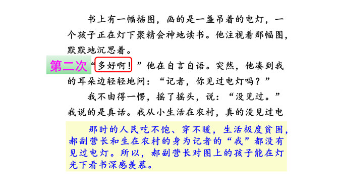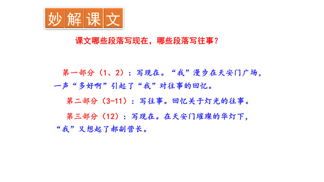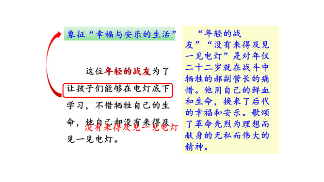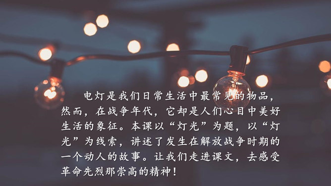 电灯是我们日常生活中最常见的物品,然而,在战争年代,它却是人们心目中美好生活的象征。本课以“灯光”为题,以“灯光”为线索,讲述了发生在解放战争时期的一个动人的故事。让我们走进课文,去感受革命先烈那崇高的精神!再读文中描写灯光的句子,说说课文为什么以“灯光”为题?有什么深刻的含义?灯光象征幸福安乐的生活,课文以“灯光”为题,突出了革命烈士对未来的美好憧憬,赞叹了他们为理想而英勇献身的崇高精神。所属专题:灯光ppt。