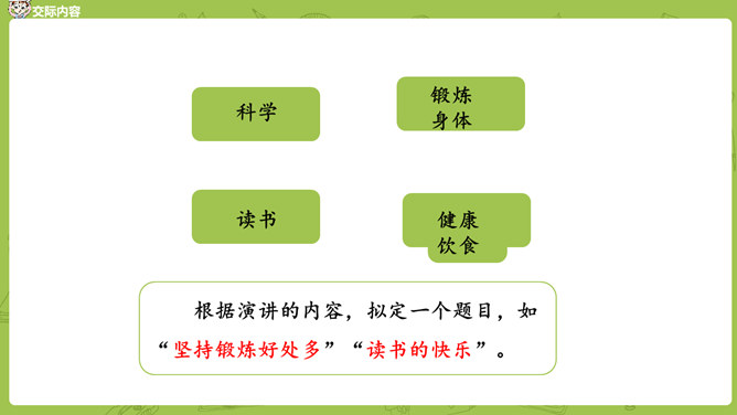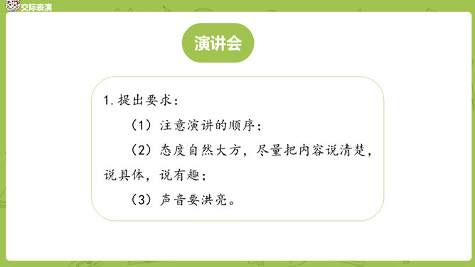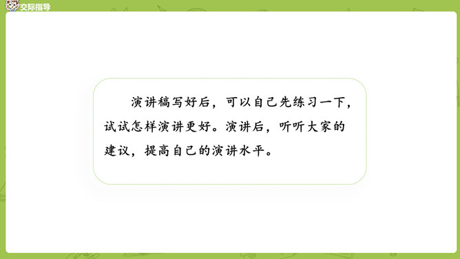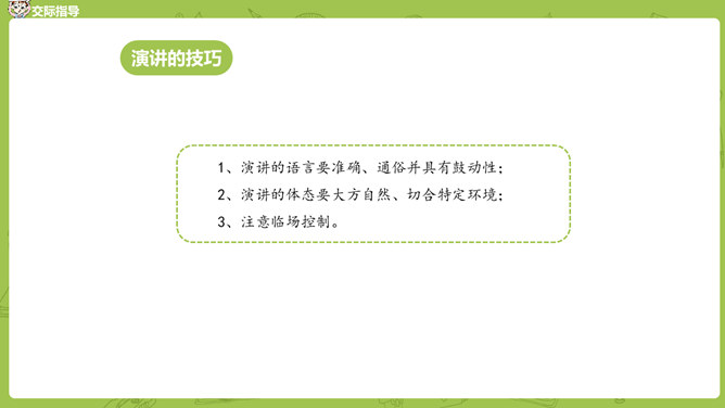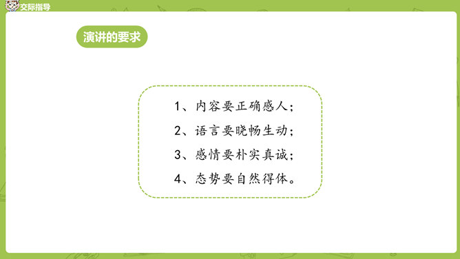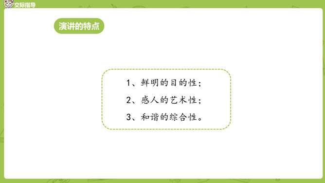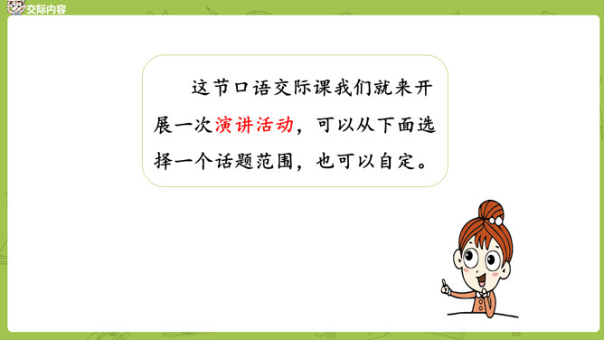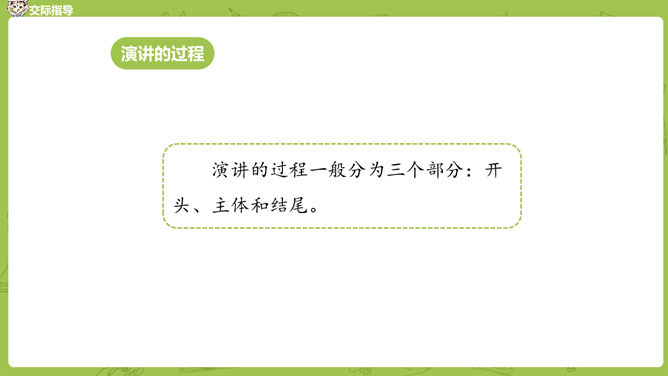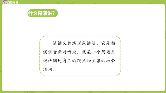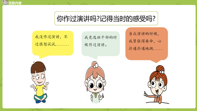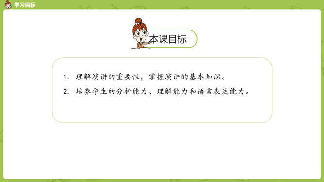 1. 理解演讲的重要性,掌握演讲的基本知识。2. 培养学生的分析能力、理解能力和语言表达能力。演讲又称演说或讲演。它是指演讲者面对听众,就某一个问题系统地阐述自己的观点和主张的社会活动。1、鲜明的目的性;2、感人的艺术性;3、和谐的综合性。1、内容要正确感人;2、语言要晓畅生动;3、感情要朴实真诚;4、态势要自然得体。演讲的过程一般分为三个部分:开头、主体和结尾。所属专题:演讲ppt。