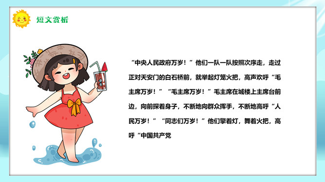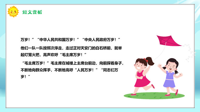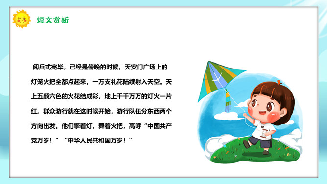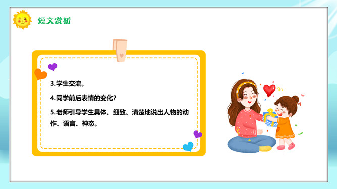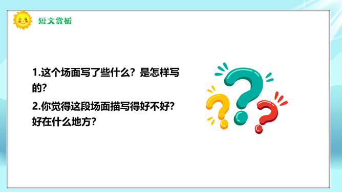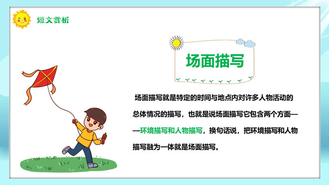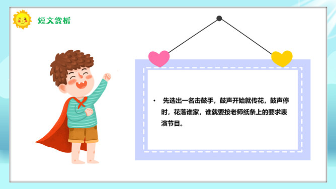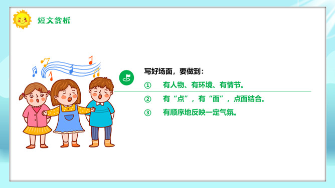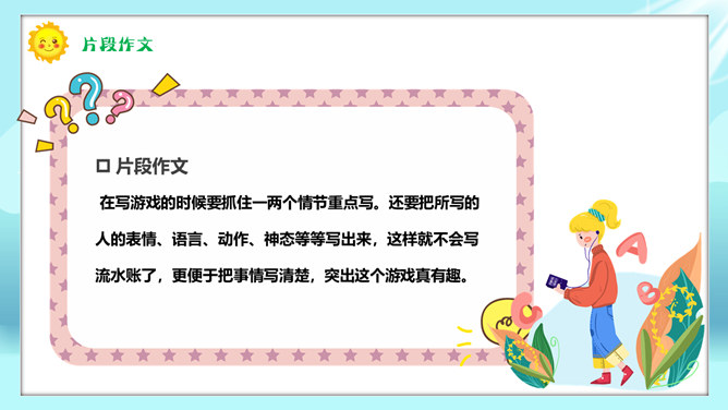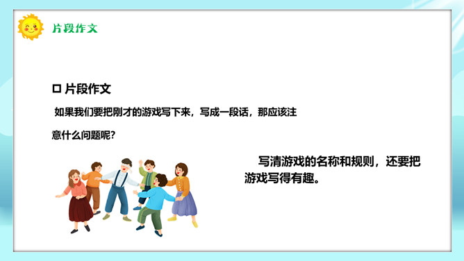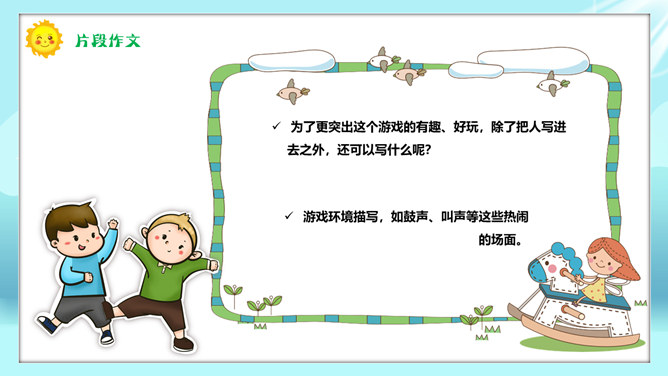 写游戏的时候要抓住一两个情节重点写。还要把所写的人的表情、语言、动作、神态等等写出来,这样就不会写流水账了,更便于把事情写清楚,突出这个游戏真有趣。场面描写就是特定的时间与地点内对许多人物活动的总体情况的描写,也就是说场面描写它包含两个方面——环境描写和人物描写,换句话说,把环境描写和人物描写融为一体就是场面描写。为了更突出这个游戏的有趣、好玩,除了把人写进去之外,还可以写什么呢?所属专题:多彩的活动ppt。
