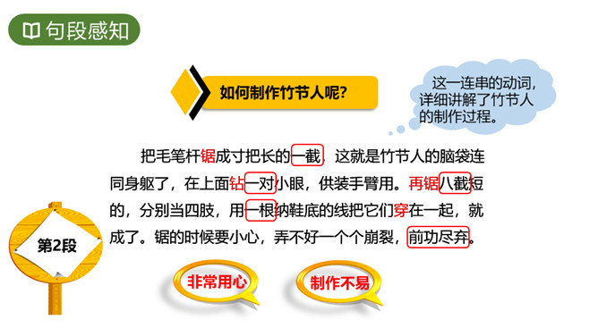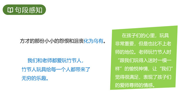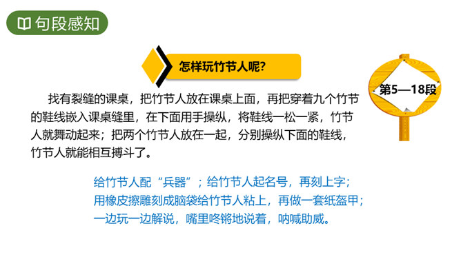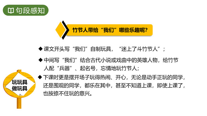 竹节人带给“我们”哪些乐趣呢?课文开头写“我们”自制玩具,“迷上了斗竹节人”;中间写“我们”结合古代小说或戏曲中的英雄人物,给竹节人配“兵器”、起名号,忘情地玩竹节人;下课时更是摆开场子玩得热闹、开心,无论是动手正玩的同学,还是围观的同学,都乐在其中,甚至不知道上课,即使上课了,也按捺不住玩的意兴。在孩子们的心里,玩具非常重要,但是也比不上老师的地位。老师玩竹节人时“跟我们玩得入迷时一模一样”的愉悦神情,让“我们”觉得很满足,表现了孩子们的爱师尊师的情感。所属专题:竹节人ppt。