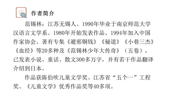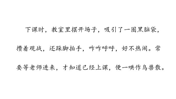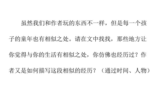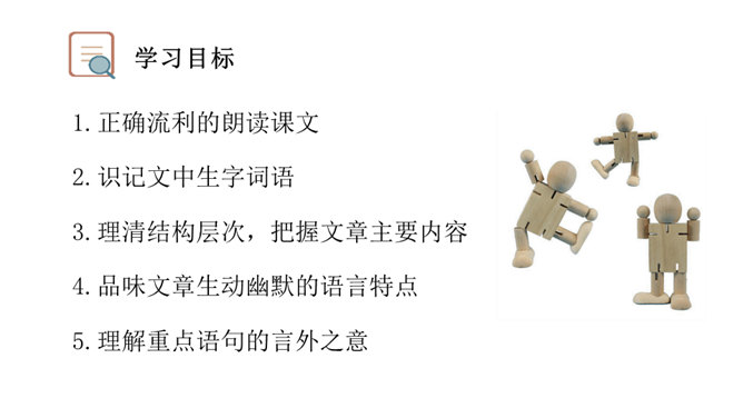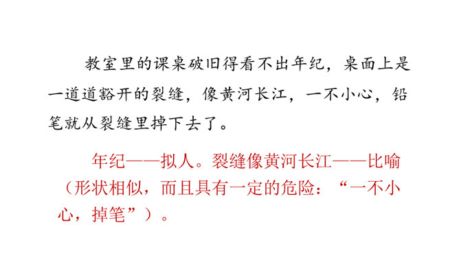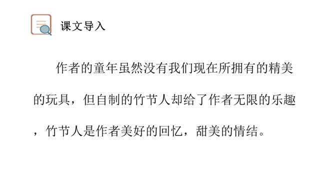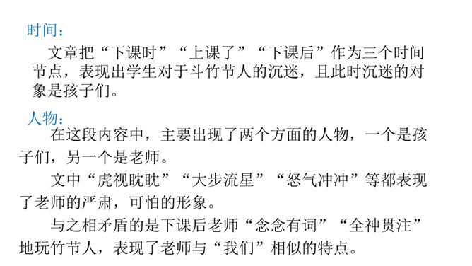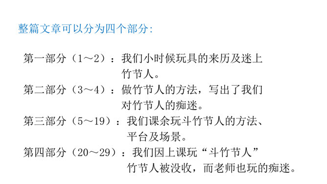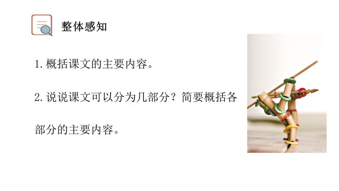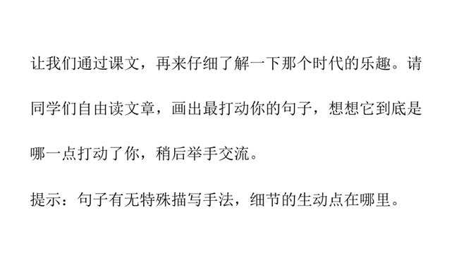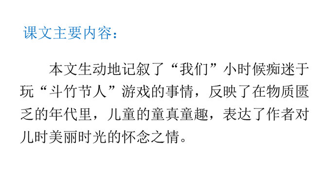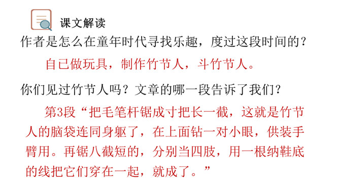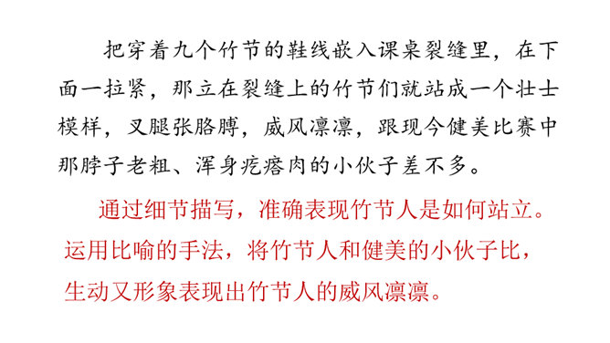 让我们通过课文,再来仔细了解一下那个时代的乐趣。请同学们自由读文章,画出最打动你的句子,想想它到底是哪一点打动了你,稍后举手交流。提示:句子有无特殊描写手法,细节的生动点在哪里。年纪——拟人。裂缝像黄河长江——比喻(形状相似,而且具有一定的危险:“一不小心,掉笔”)。通过细节描写,准确表现竹节人是如何站立。运用比喻的手法,将竹节人和健美的小伙子比,生动又形象表现出竹节人的威风凛凛。所属专题:竹节人ppt。