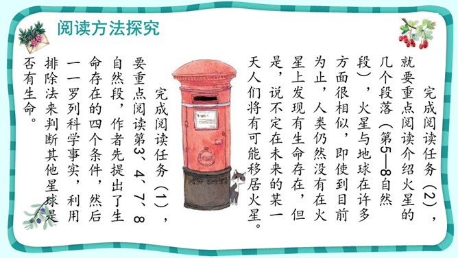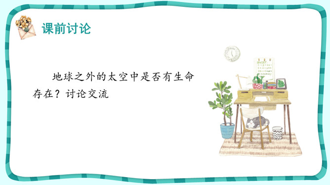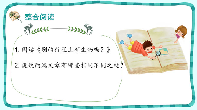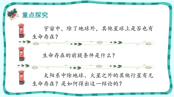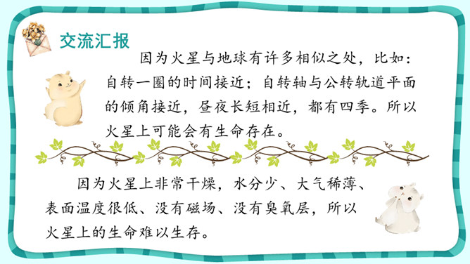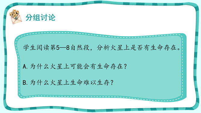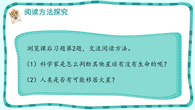 地球之外的太空中是否有生命存在?讨论交流。宇宙中,除了地球外,其他星球上是否也有生命存在? 生命存在的前提条件是什么? 太阳系中除地球、火星之外的其他行星有无生命存在?是如何得出这一结论的?学生阅读第5—8自然段,分析火星上是否有生命存在。 A.为什么火星上可能会有生命存在?B.为什么火星上生命难以生存? 浏览课后习题第2题,交流阅读方法。科学家是怎么判断其他星球有没有生命的呢?人类是否有可能移居火星?所属专题:宇宙生命之谜ppt。