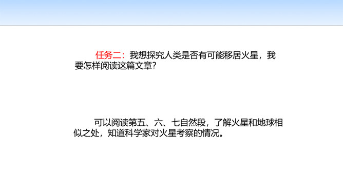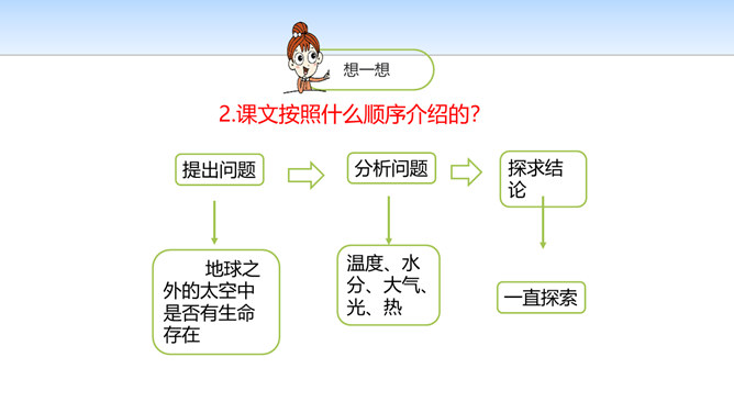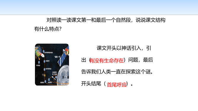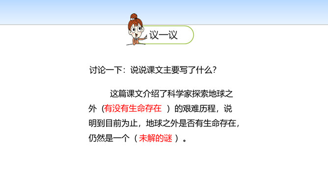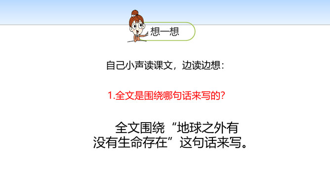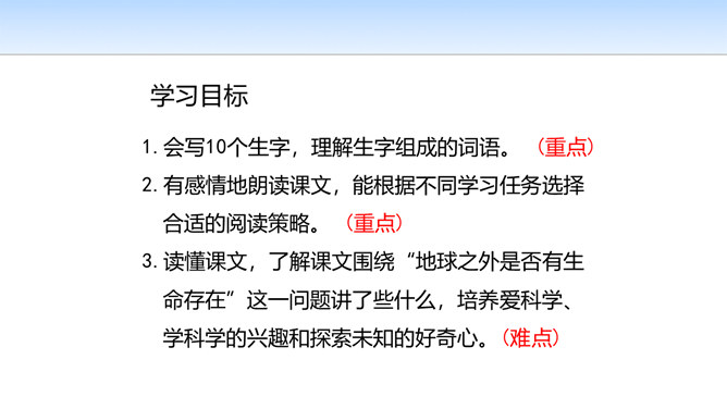1.会写10个生字,理解生字组成的词语。 (重点)2.有感情地朗读课文,能根据不同学习任务选择合适的阅读策略。 (重点)3.读懂课文,了解课文围绕“地球之外是否有生命存在”这一问题讲了些什么,培养爱科学、学科学的兴趣和探索未知的好奇心。(难点)科普文章一般用轻松、活泼的笔调,解说某一方面的科学技术知识。有科技的技术性、内容的生动性、题材的广泛性、篇幅的简短性。全文围绕“地球之外有没有生命存在”这句话来写。所属专题:宇宙生命之谜ppt。