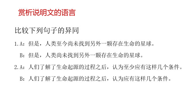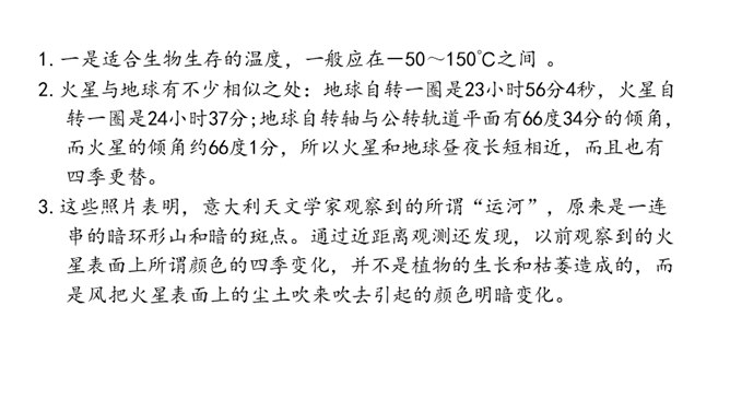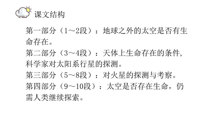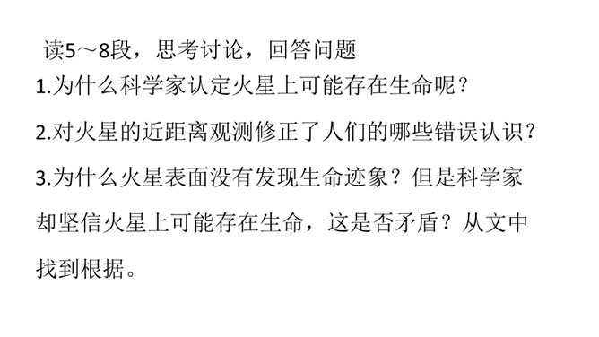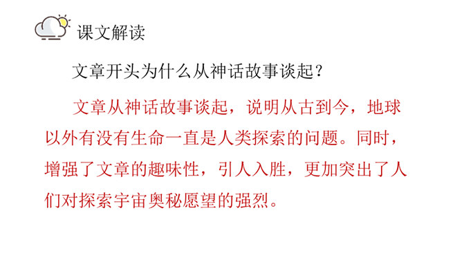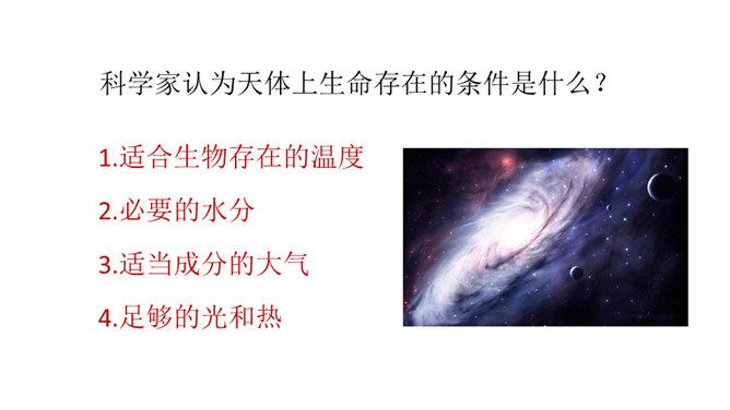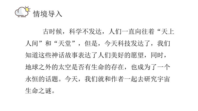 古时候,科学不发达,人们一直向往着“天上人间”和“天堂”,但是,今天科技发达了,我们知道这些神话故事表达了人们美好的愿望,同时,地球之外的太空是否有生命的存在,也成为了一个永恒的话题。今天,我们就和作者一起去研究宇宙生命之谜。1.识记理解文中生字词语。2.理清文章思路,概括层意。3.初步理解说明方法及其作用。4.初步分析说明文语言的准确性和严密性。科学家认为天体上生命存在的条件是什么?所属专题:宇宙生命之谜ppt。