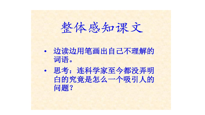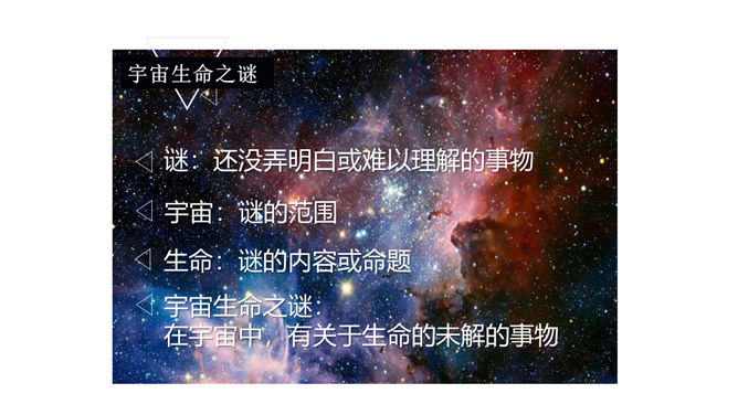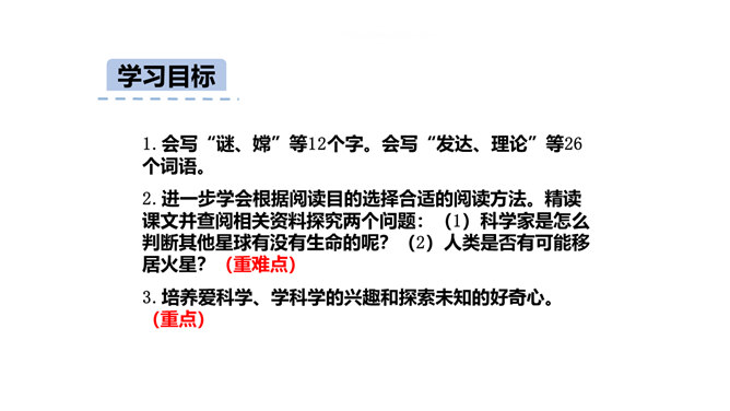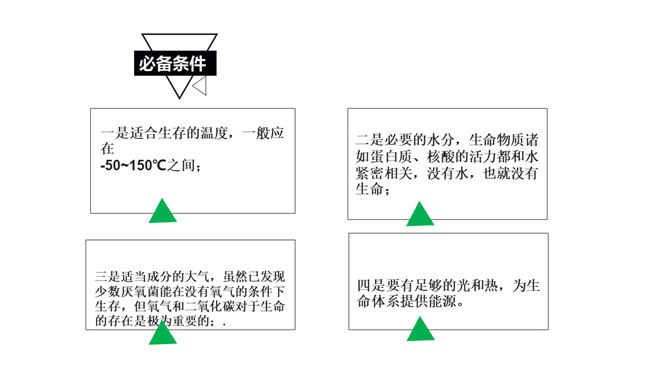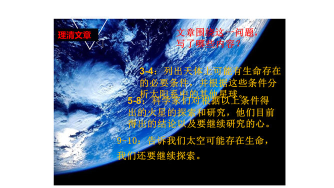 为了了解其他星球是否存在生命,你在阅读时是怎么做的?这位同学的思考给了你哪些启发?为了了解其他星球是否存在生命,我重点阅读了第二至八自然段,知道了生命存在的条件;根据这些条件分析,水星、金星、木星、土星、天王星和海王星不可能存在生命;太阳系中还可能存在生命的星球是火星,但根据宇宙飞船的观测,火星上也基本不可能存在生命。我又查阅了资料,对课文观点进行了进一步的验证,近年来对火星的研究虽然有新发现,但始终没有发现生命存在的强有力的证据。所属专题:宇宙生命之谜ppt。