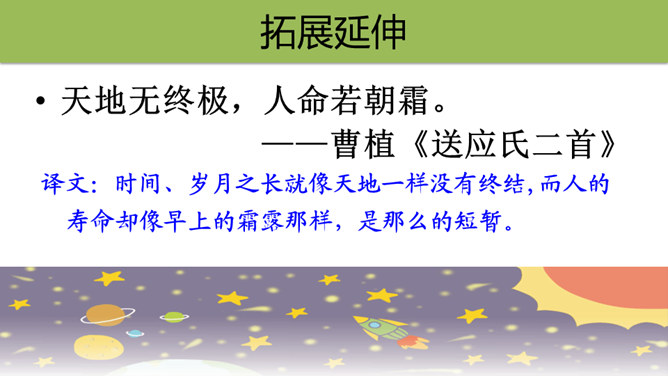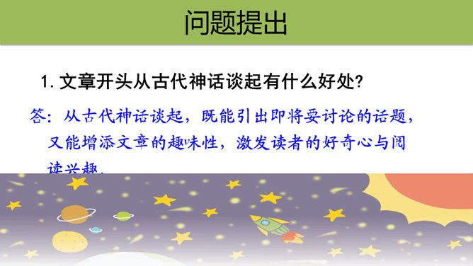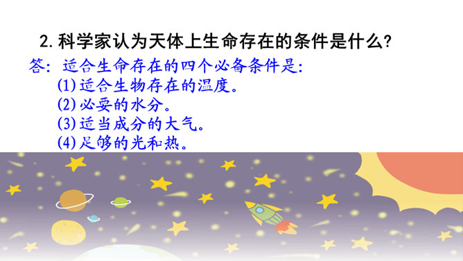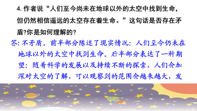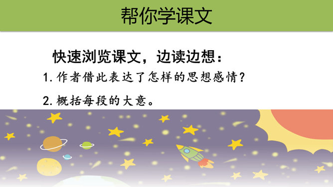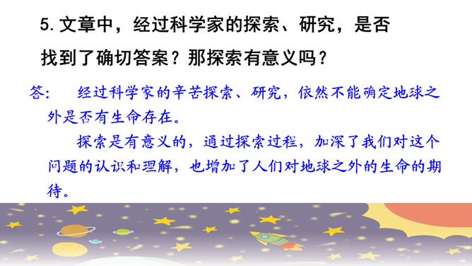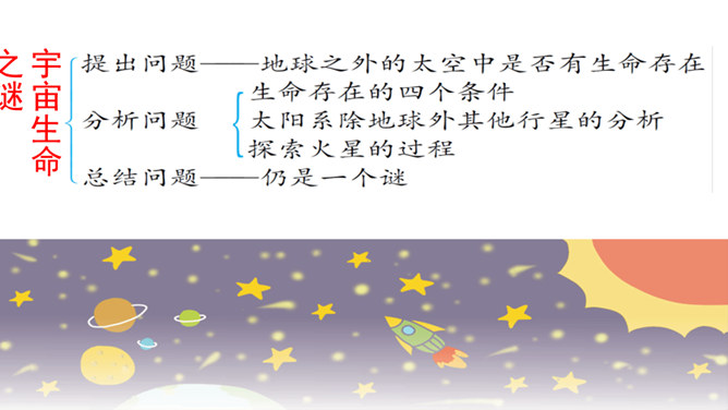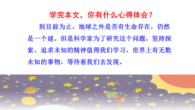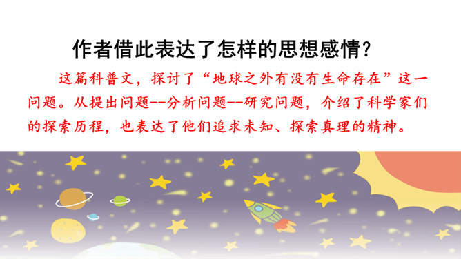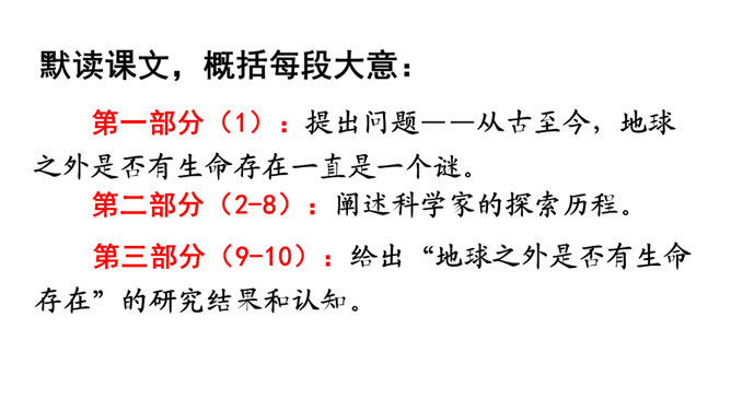 快速浏览课文,边读边想:1.作者借此表达了怎样的思想感情?2.概括每段的大意。作者借此表达了怎样的思想感情?这篇科普文,探讨了“地球之外有没有生命存在”这一问题。从提出问题--分析问题--研究问题,介绍了科学家们的探索历程,也表达了他们追求未知、探索真理的精神。默读课文,概括每段大意:第一部分(1):提出问题——从古至今,地球之外是否有生命存在一直是一个谜。第二部分(2-8):阐述科学家的探索历程。第三部分(9-10):给出“地球之外是否有生命存在”的研究结果和认知。所属专题:宇宙生命之谜ppt。
