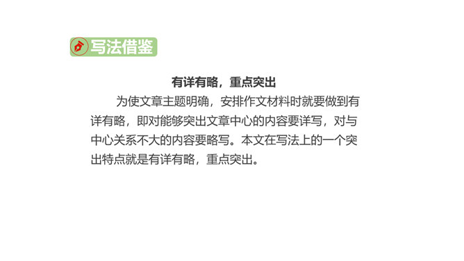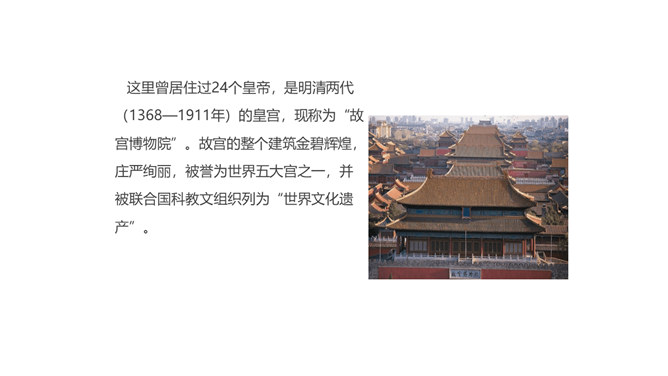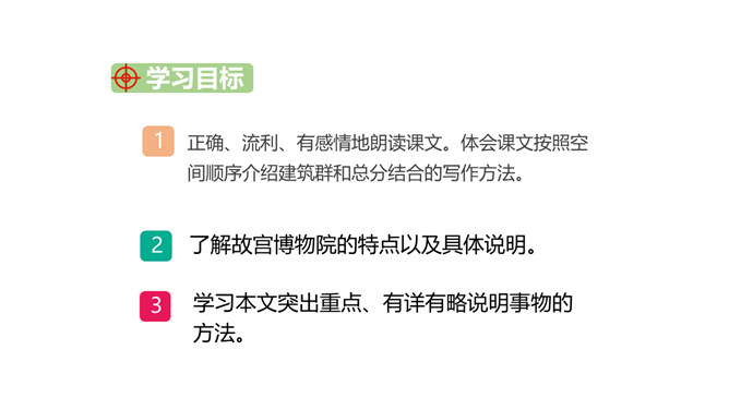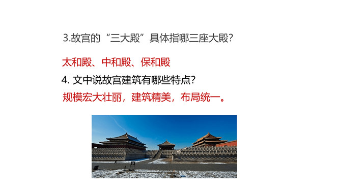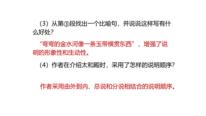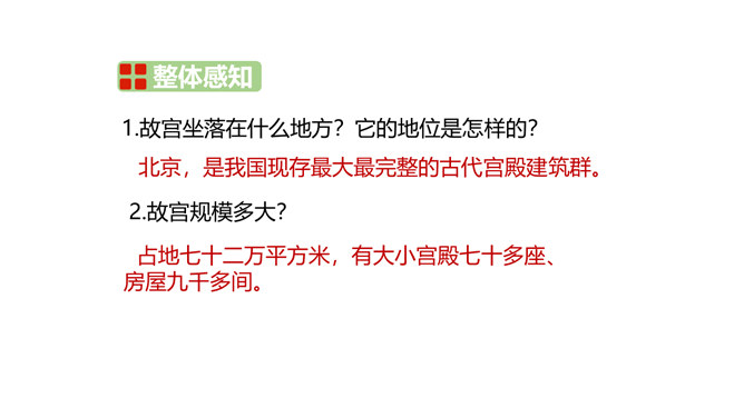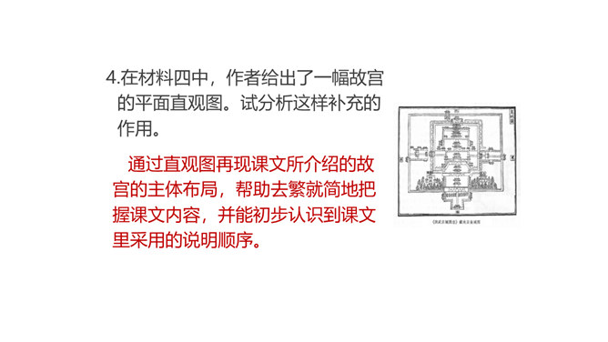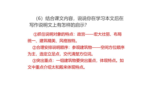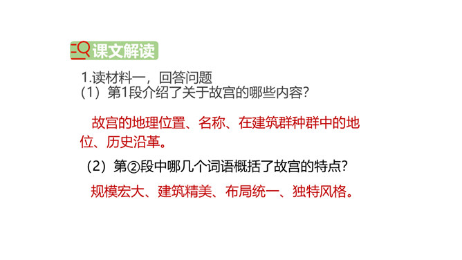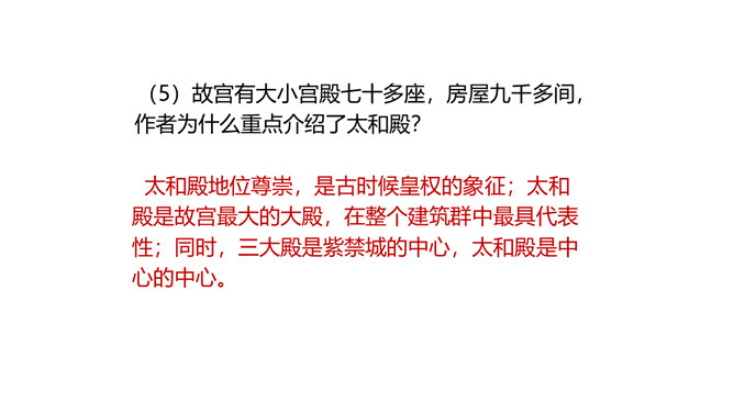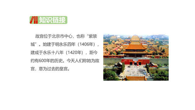 这篇解说词按照空间顺序,采用移步换景的方法介绍了故宫的主要建筑及其特色,表达了对故宫的热爱和赞颂,歌颂了中国古代劳动人民的智慧和伟大的创造力,展示了中华民族的文化瑰宝。谈一谈:通过阅读这篇课文,你有怎样的感悟?故宫是文艺宝库,是我国古代劳动人民的汗水和智慧结晶。他是一座伟大而奇特的建筑,同时也是中华几百年来的历史见证,这是我国的一个象征,一个标志,我们为他骄傲和自豪。所属专题:故宫博物院ppt。