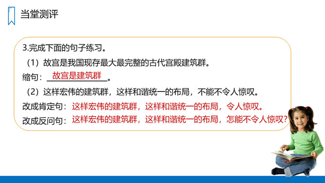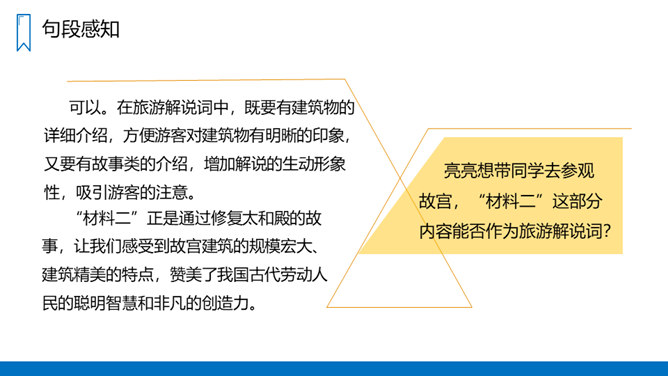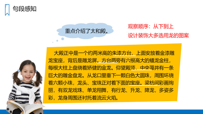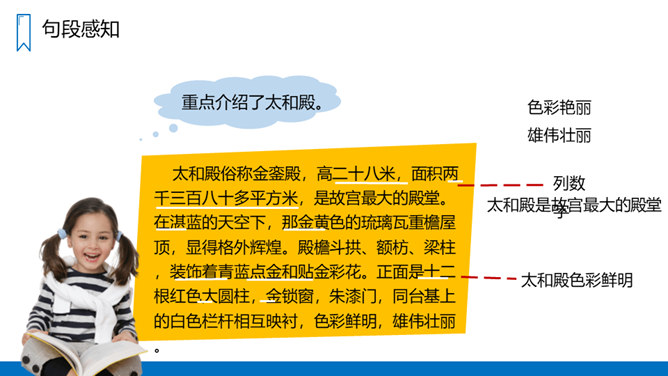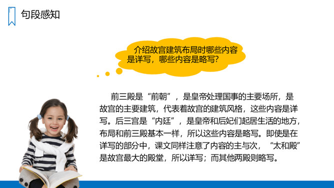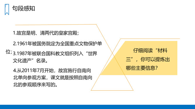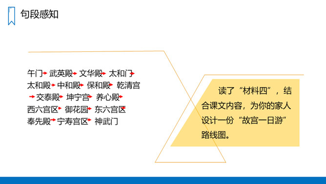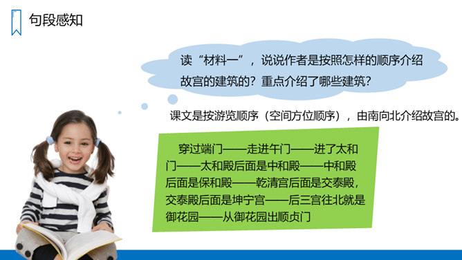 读“材料一”,说说作者是按照怎样的顺序介绍故宫的建筑的?重点介绍了哪些建筑?课文是按游览顺序(空间方位顺序),由南向北介绍故宫的。穿过端门——走进午门——进了太和门——太和殿后面是中和殿——中和殿后面是保和殿——乾清宫后面是交泰殿,交泰殿后面是坤宁宫——后三宫往北就是御花园——从御花园出顺贞门。介绍故宫建筑布局时哪些内容是详写,哪些内容是略写?所属专题:故宫博物院ppt。