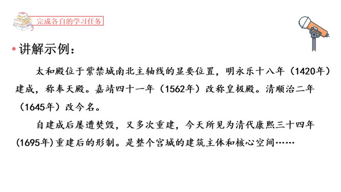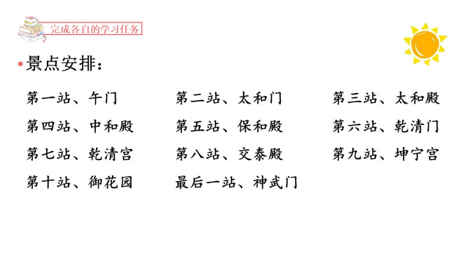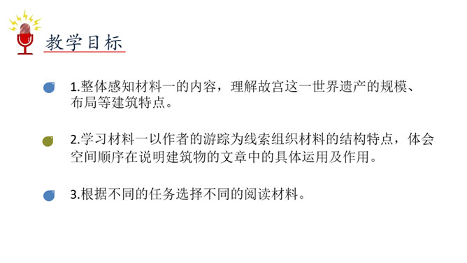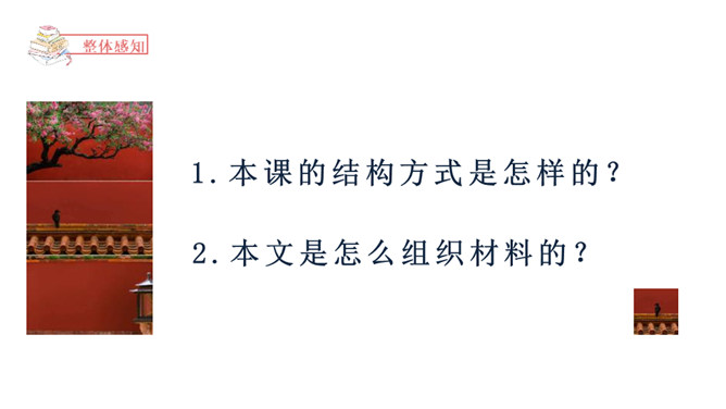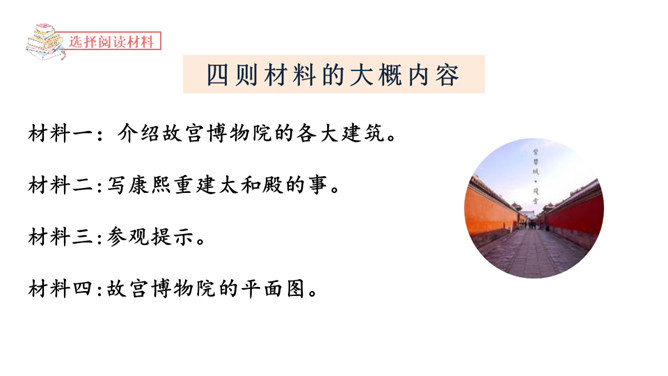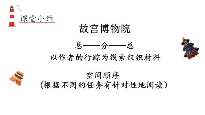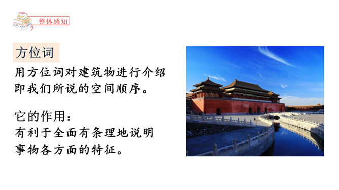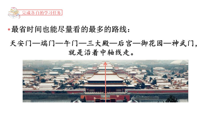 1.整体感知材料一的内容,理解故宫这一世界遗产的规模、布局等建筑特点。2.学习材料一以作者的游踪为线索组织材料的结构特点,体会空间顺序在说明建筑物的文章中的具体运用及作用。3.根据不同的任务选择不同的阅读材料。用方位词对建筑物进行介绍即我们所说的空间顺序。它的作用:有利于全面有条理地说明事物各方面的特征。1.本课的结构方式是怎样的?2.本文是怎么组织材料的?所属专题:故宫博物院ppt。