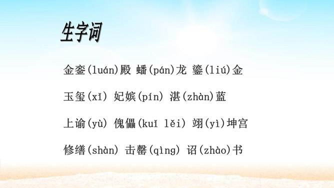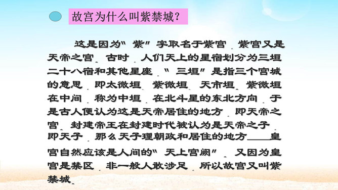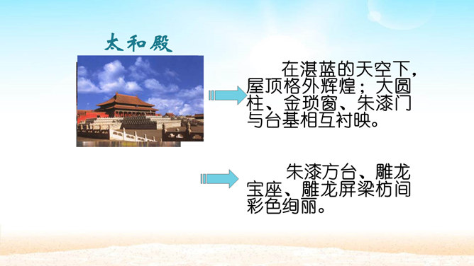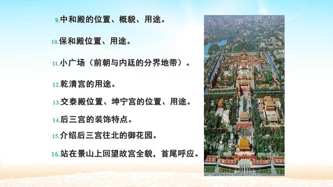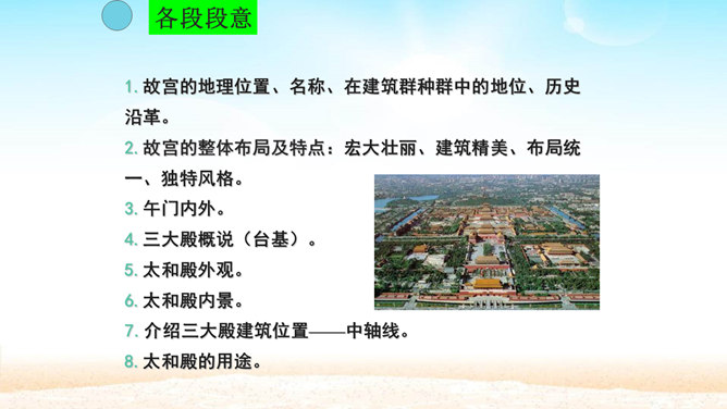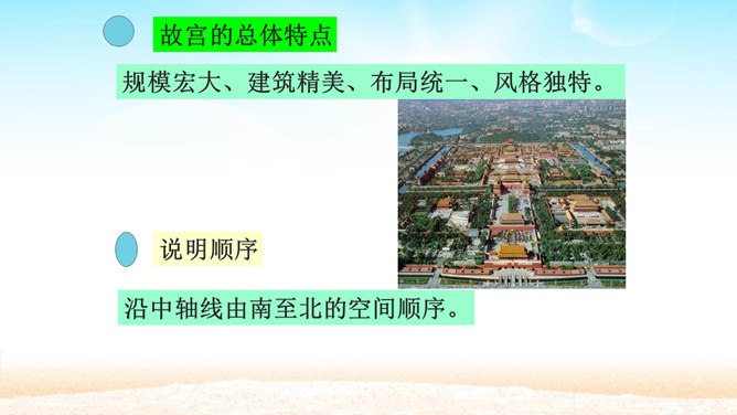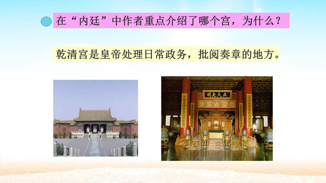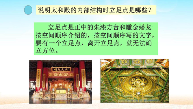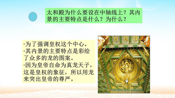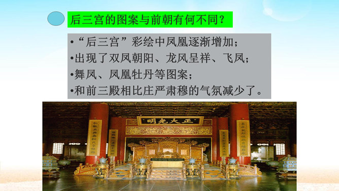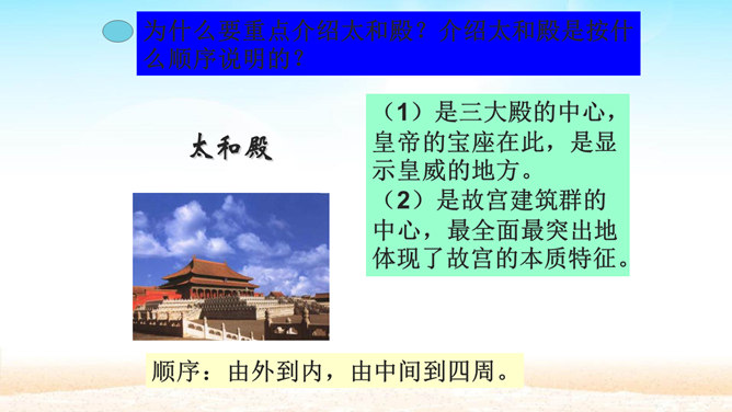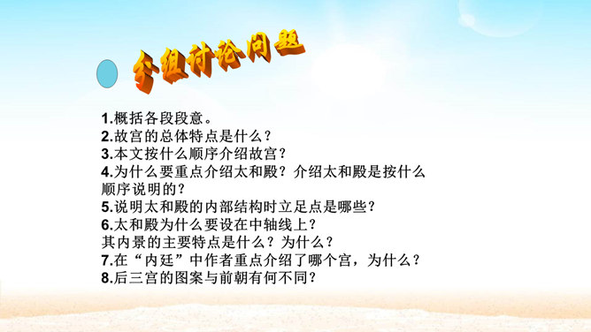 分组讨论问题:1.概括各段段意。2.故宫的总体特点是什么?3.本文按什么顺序介绍故宫?4.为什么要重点介绍太和殿?介绍太和殿是按什么顺序说明的?5.说明太和殿的内部结构时立足点是哪些?6.太和殿为什么要设在中轴线上?其内景的主要特点是什么?为什么?7.在“内廷”中作者重点介绍了哪个宫,为什么?8.后三宫的图案与前朝有何不同?规模宏大、建筑精美、布局统一、风格独特。所属专题:故宫博物院ppt。