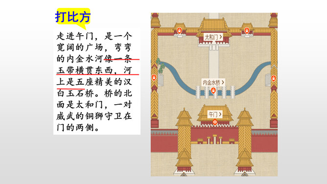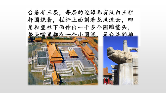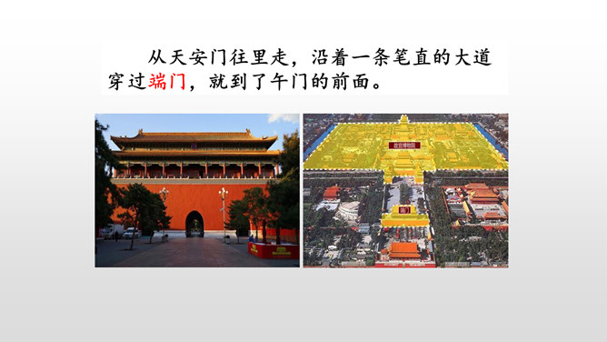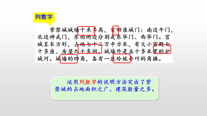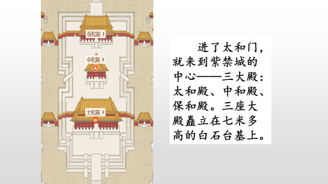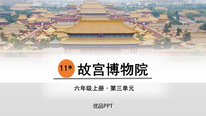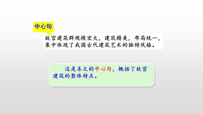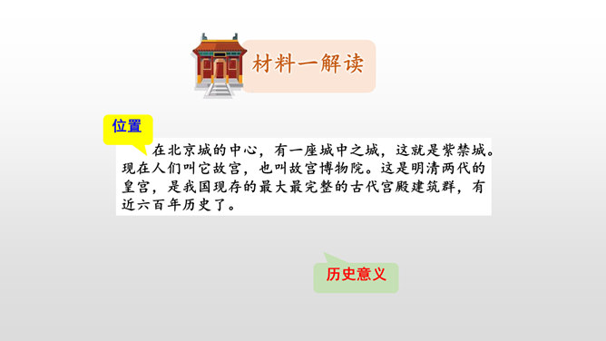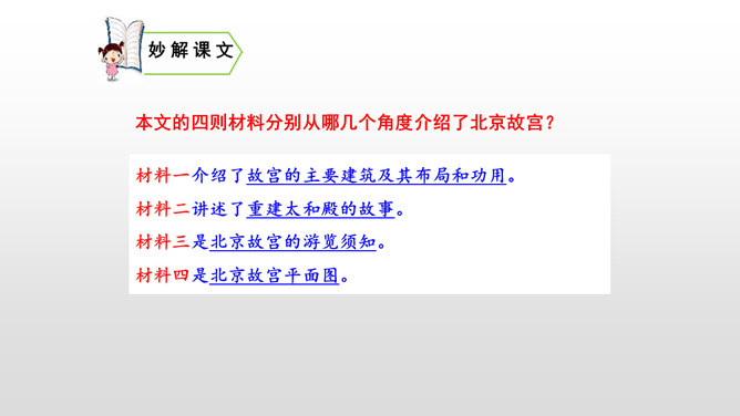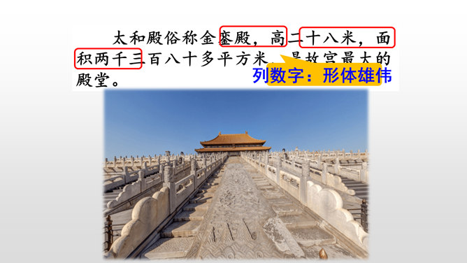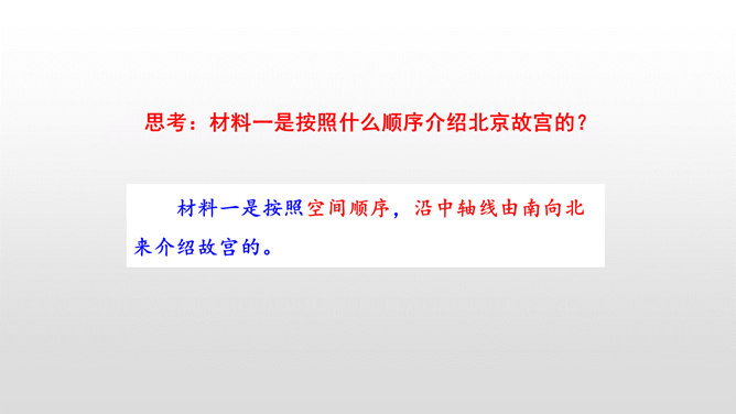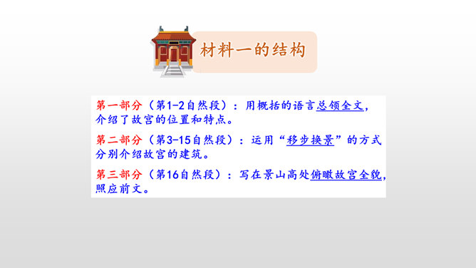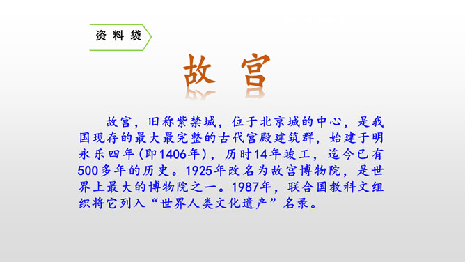第一部分(第1-2自然段):用概括的语言总领全文,介绍了故宫的位置和特点。第二部分(第3-15自然段):运用“移步换景”的方式分别介绍故宫的建筑。第三部分(第16自然段):写在景山高处俯瞰故宫全貌,照应前文。阅读材料一的第1、2自然段,在原文中找一找故宫博物院的总体特征是什么。运用列数字的说明方法突出了紫禁城的占地面积之广、建筑数量之多。这是本文的中心句,概括了故宫建筑的整体特点。所属专题:故宫博物院ppt。