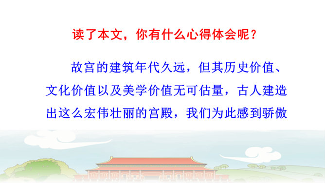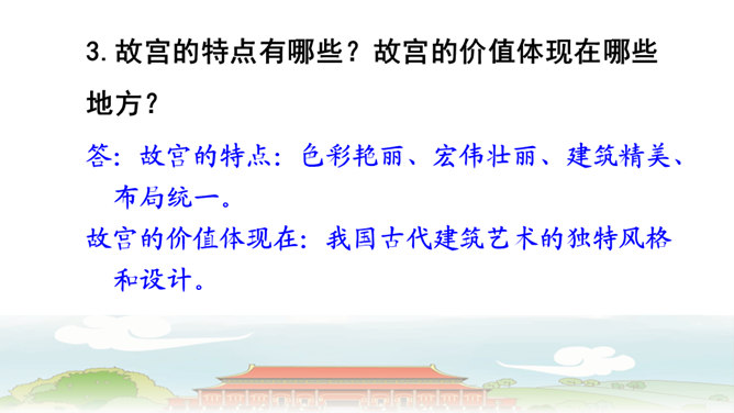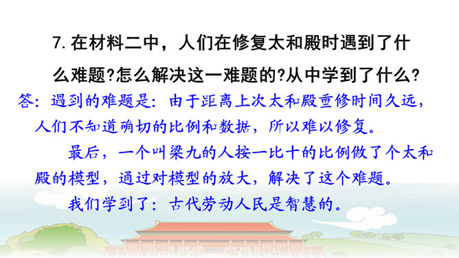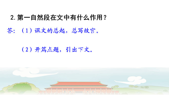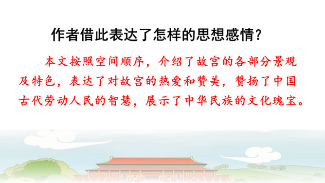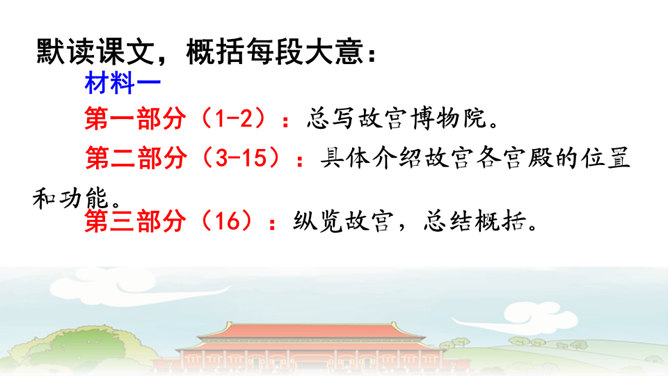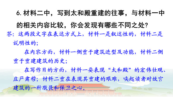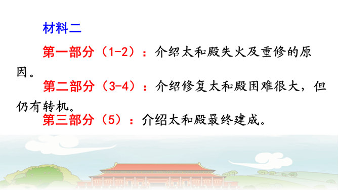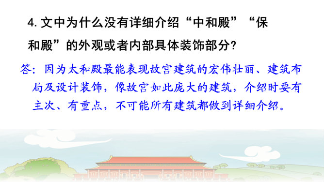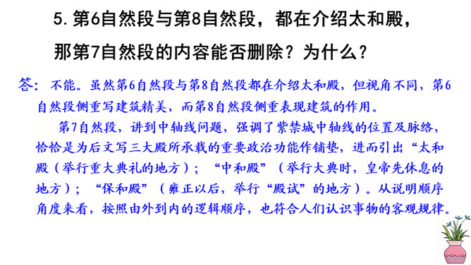 第6自然段与第8自然段,都在介绍太和殿,那第7自然段的内容能否删除?为什么?答:不能。虽然第6自然段与第8自然段都在介绍太和殿,但视角不同,第6自然段侧重写建筑精美,而第8自然段侧重表现建筑的作用。第7自然段,讲到中轴线问题,强调了紫禁城中轴线的位置及脉络,恰恰是为后文写三大殿所承载的重要政治功能作铺垫,进而引出“太和殿(举行重大典礼的地方);“中和殿”(举行大典时,皇帝先休息的地方);“保和殿”(雍正以后,举行“殿试”的地方)。从说明顺序角度来看,按照由外到内的逻辑顺序,也符合人们认识事物的客观规律。所属专题:故宫博物院ppt。