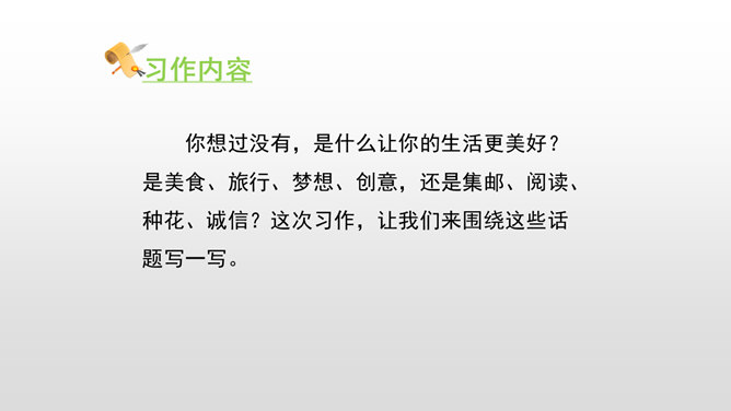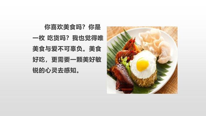 你喜欢旅游吗?去过哪儿?哪次出行令你最愉快?说说你的旅游经历给你带来了哪些新奇感受。你喜欢美食吗?你是一枚 吃货吗?我也觉得唯美食与爱不可辜负。美食好吃,更需要一颗美好敏锐的心灵去感知。你爱阅读吗?“书中自有颜如玉,书中自有黄金屋。”读书可以见到海量的人和物,增广见闻。你有什么爱好?在我看来,一个有爱好或者癖好的人,该是有趣味的,生动的,有温度的!你想过没有,是什么让你的生活更美好?所属专题:让生活更美好ppt。