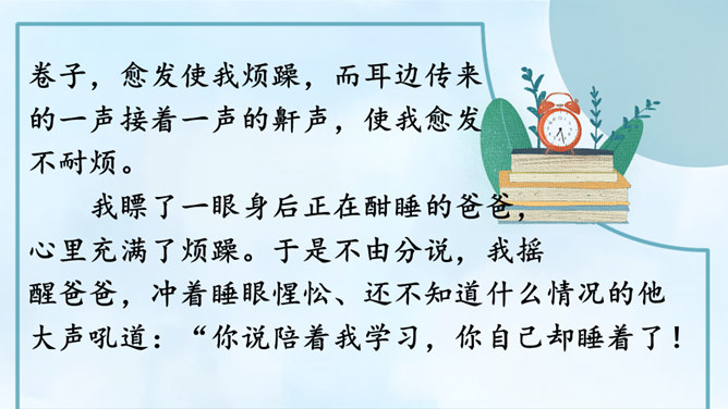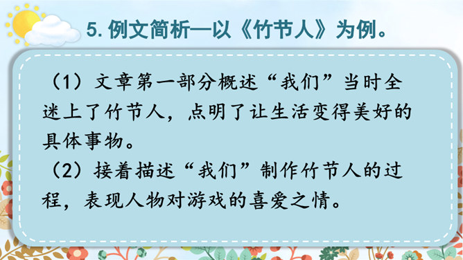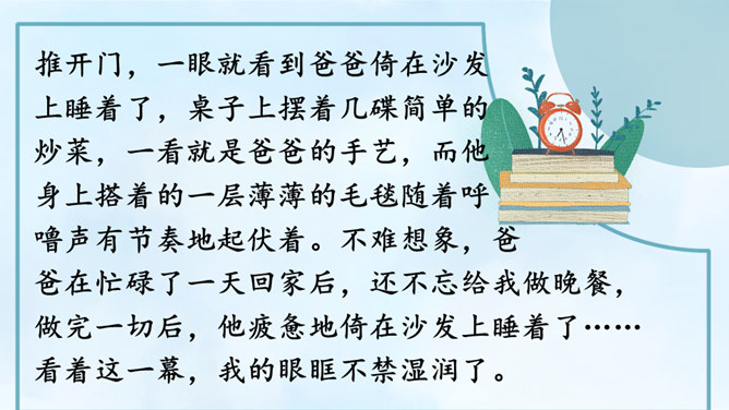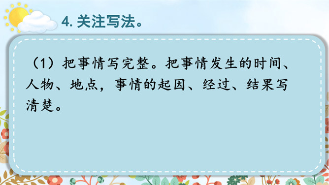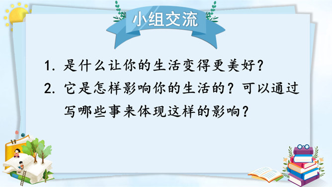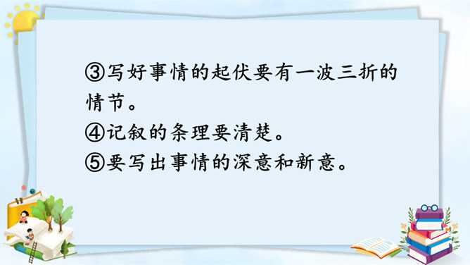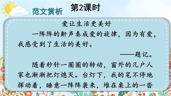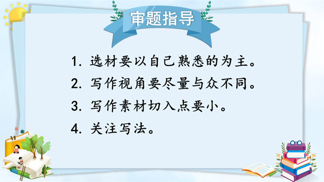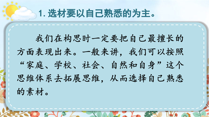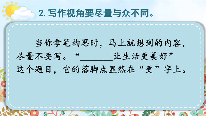 从自我生活实际来拟题,从自我兴趣爱好来拟题,这就具体得多,就能通过自我的生活细节来写活名著、科学、自然等对自己的深刻影响,而且可以采用多种表达方式,生动形象地展现自己的体验与感悟。我们在构思时一定要把自己最擅长的方面表现出来。一般来讲,我们可以按照“家庭、学校、社会、自然和自身”这个思维体系去拓展思维,从而选择自己熟悉的素材。把事情写完整。把事情发生的时间、人物、地点写清楚。所属专题:让生活更美好ppt。