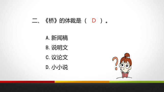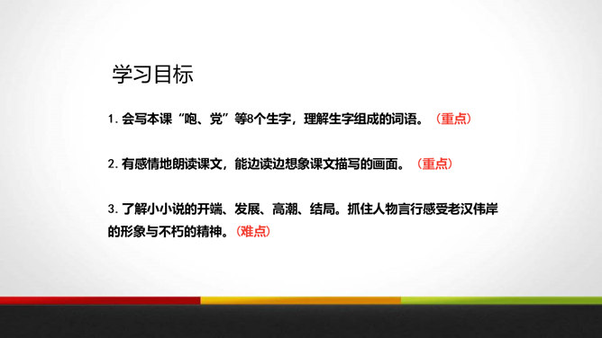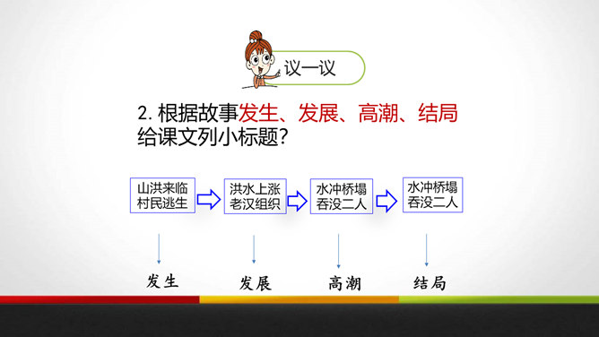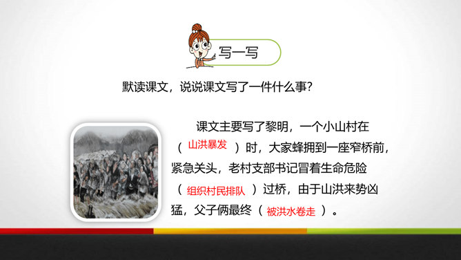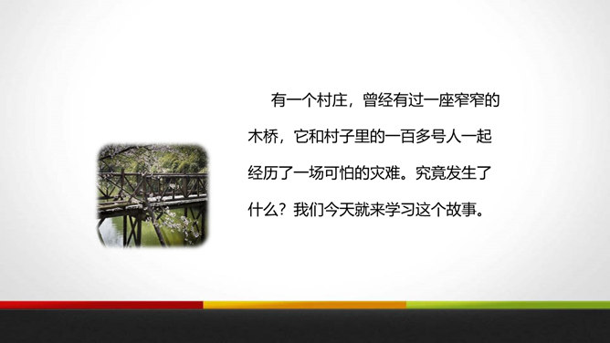 会写本课“咆、党”等8个生字,理解生字组成的词语。 (重点)有感情地朗读课文,能边读边想象课文描写的画面。 (重点)了解小小说的开端、发展、高潮、结局。抓住人物言行感受老汉伟岸的形象与不朽的精神。(难点)有一个村庄,曾经有过一座窄窄的木桥,它和村子里的一百多号人一起经历了一场可怕的灾难。究竟发生了什么?我们今天就来学习这个故事。自己小声读课文,边读边想:小说有什么特点?情节、人物、环境是构成小说的三大要素。所属专题:桥ppt。