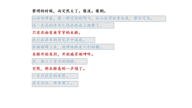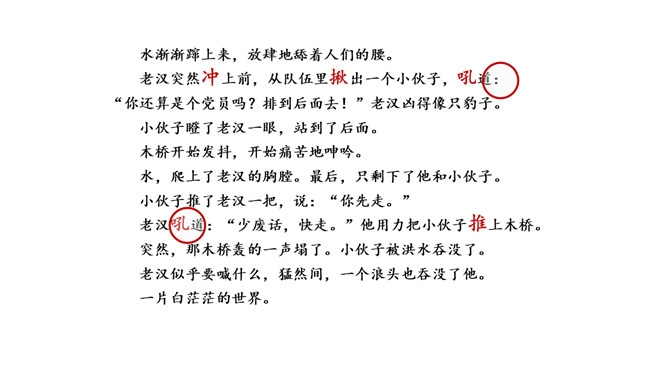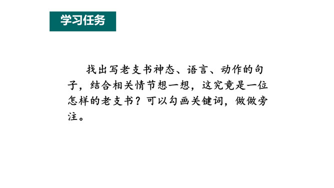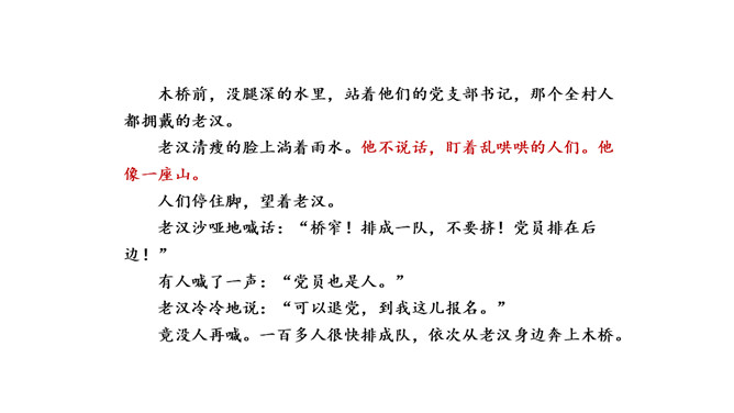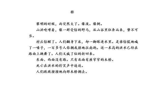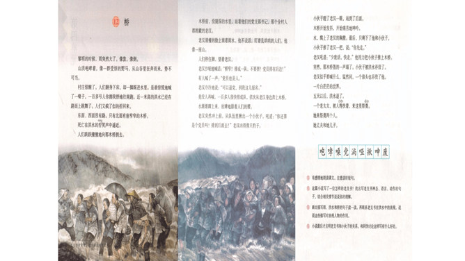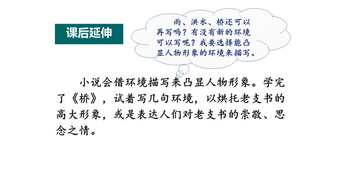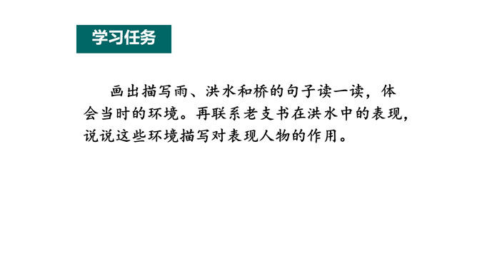 小说大多是虚构的,却又有生活的影子。读小说,关注情节、环境,感受人物形象。找出写老支书神态、语言、动作的句子,结合相关情节想一想,这究竟是一位怎样的老支书?可以勾画关键词,做做旁注。画出描写雨、洪水和桥的句子读一读,体会当时的环境。再联系老支书在洪水中的表现,说说这些环境描写对表现人物的作用。小说会借环境描写来凸显人物形象。试着写几句环境,以烘托老支书的高大形象。所属专题:桥ppt。