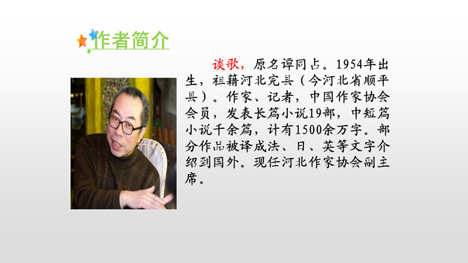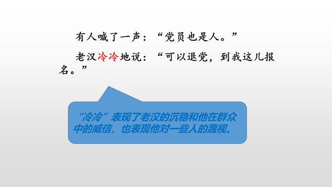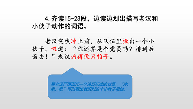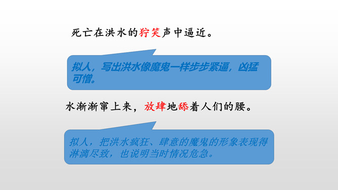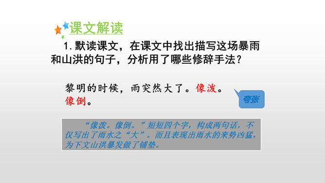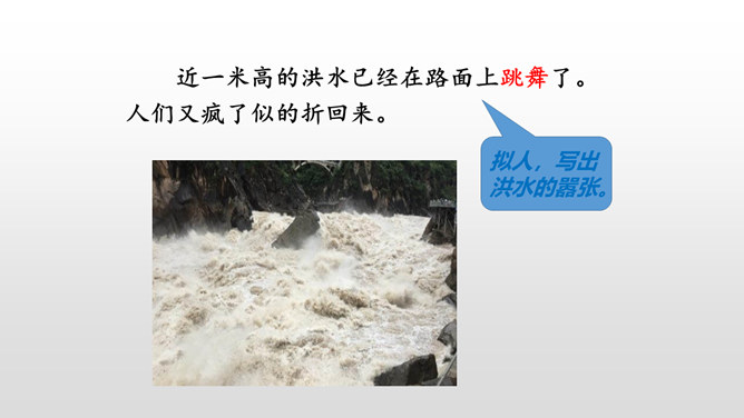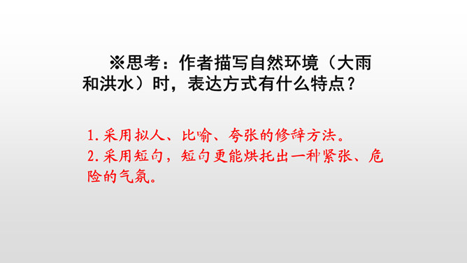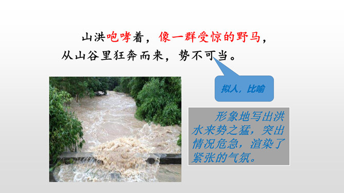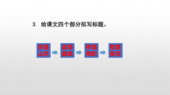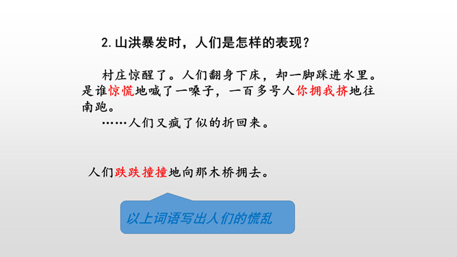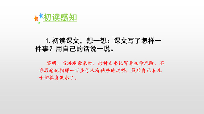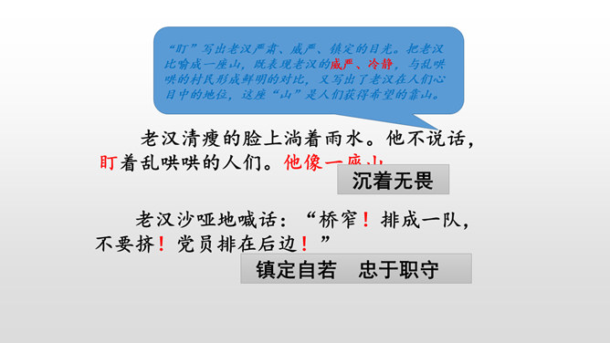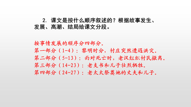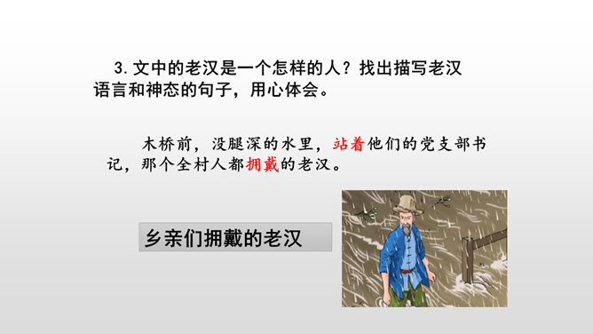 课文是按什么顺序叙述的?根据故事发生、发展、高潮、结局给课文分段。按事情发展的顺序分四部分。第一部分(1-4):黎明时分,村庄突然遭遇洪灾。第二部分(5-13):面对死亡时,老汉组织村民撤离。第三部分(14-23):老支书和儿子壮烈牺牲。第四部分(24-27):老太太祭奠她的丈夫和儿子。作者描写自然环境(大雨和洪水)时,表达方式有什么特点?采用拟人、比喻、夸张的修辞方法。采用短句,短句更能烘托出一种紧张、危险的气氛。“盯”写出老汉严肃、威严、镇定的目光。把老汉比喻成一座山,既表现老汉的威严、冷静,与乱哄哄的村民形成鲜明的对比,又写出了老汉在人们心目中的地位,这座“山”是人们获得希望的靠山。所属专题:桥ppt。