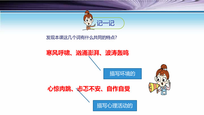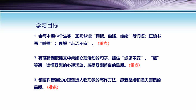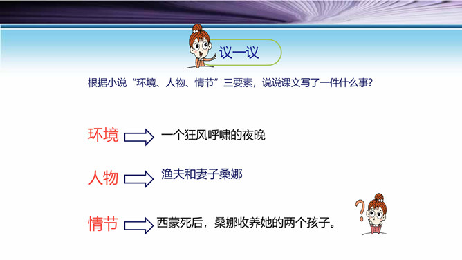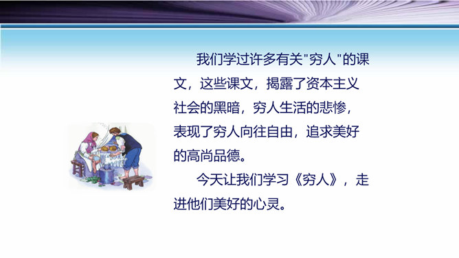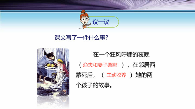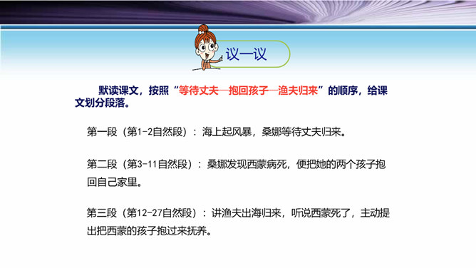 我们学过许多有关"穷人"的课文,这些课文,揭露了资本主义社会的黑暗,穷人生活的悲惨,表现了穷人向往自由,追求美好的高尚品德。今天让我们学习《穷人》,走进他们美好的心灵。默读课文,按照“等待丈夫—抱回孩子—渔夫归来”的顺序,给课文划分段落。第一段(第1-2自然段):海上起风暴,桑娜等待丈夫归来。第二段(第3-11自然段):桑娜发现西蒙病死,便把她的两个孩子抱回自己家里。第三段(第12-27自然段):讲渔夫出海归来,听说西蒙死了,主动提出把西蒙的孩子抱过来抚养。所属专题:穷人ppt。