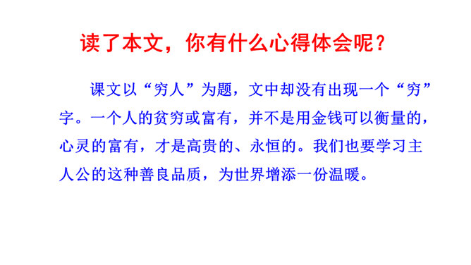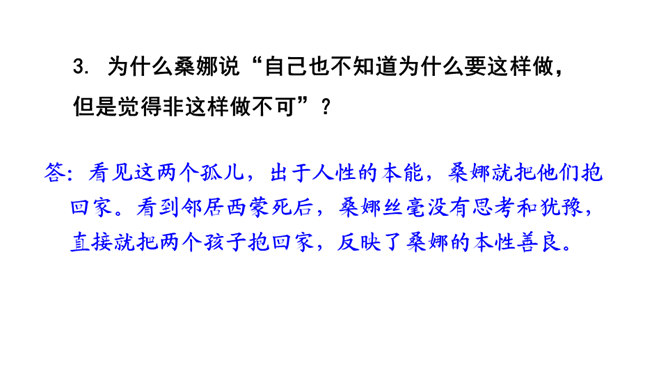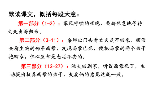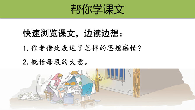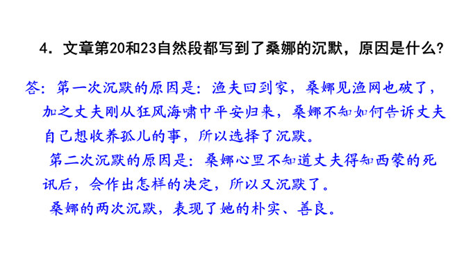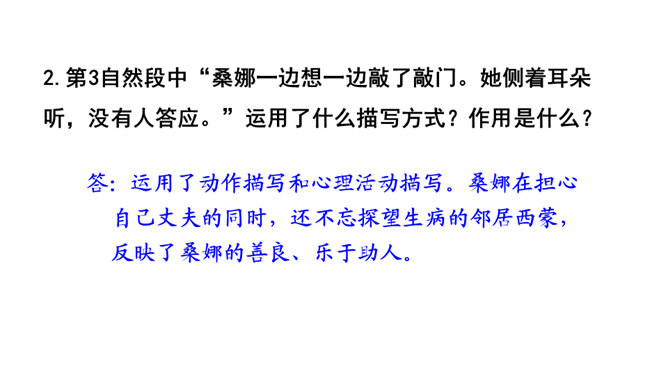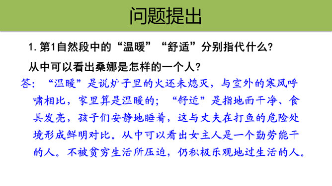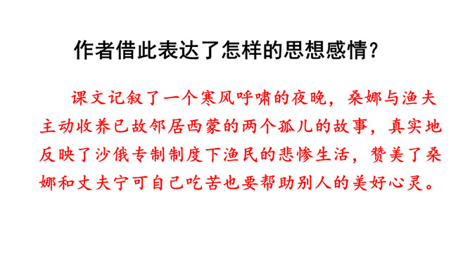 第1自然段中的“温暖”“舒适”分别指代什么?从中可以看出桑娜是怎样的一个人?“温暖”是说炉子里的火还未熄灭,与室外的寒风呼啸相比,家里算是温暖的;“舒适”是指地面干净、食具发亮,孩子们安静地睡着,这与丈夫在打鱼的危险处境形成鲜明对比。从中可以看出女主人是一个勤劳能干的人。不被贫穷生活所压迫,仍积极乐观地过生活的人。第3自然段中“桑娜一边想一边敲了敲门。她侧着耳朵听,没有人答应。”运用了什么描写方式?作用是什么?所属专题:穷人ppt。