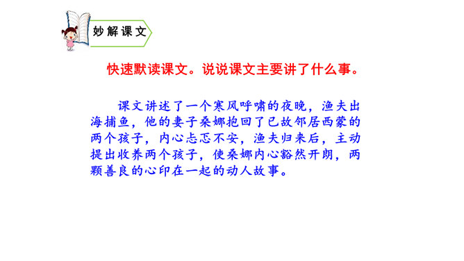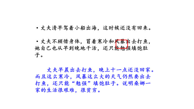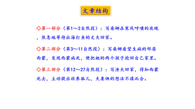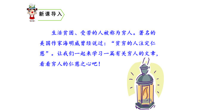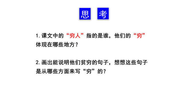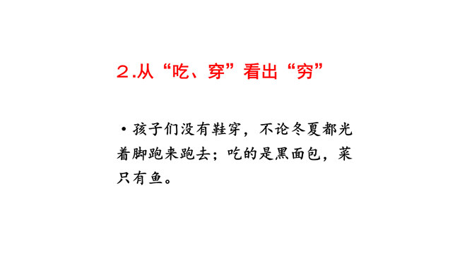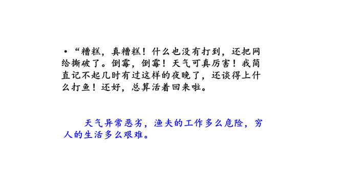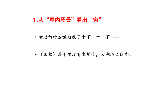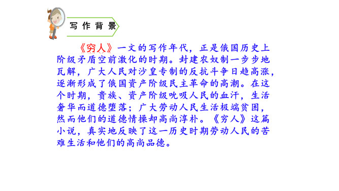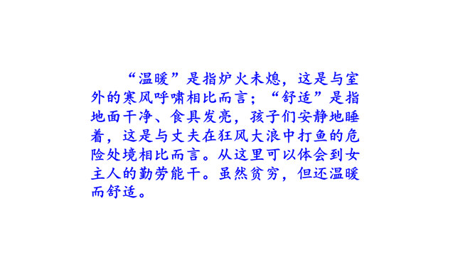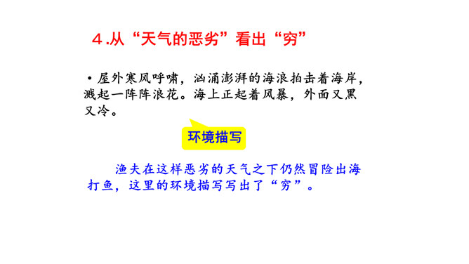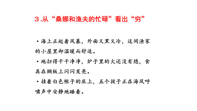 这触目惊心、使人落泪的情景,是沙俄时代穷人悲惨生活的真实写照。西蒙去世前,拿自己的衣服盖在他们身上,还用旧头巾包住他们的小脚,这一细节描写表现了人间最伟大的母爱以及西蒙死时对这两个孩子的牵挂。“温暖”是指炉火未熄,这是与室外的寒风呼啸相比而言;“舒适”是指地面干净、食具发亮,孩子们安静地睡着,这是与丈夫在狂风大浪中打鱼的危险处境相比而言。从这里可以体会到女主人的勤劳能干。虽然贫穷,但还温暖而舒适。所属专题:穷人ppt。