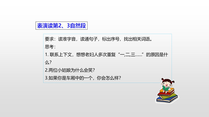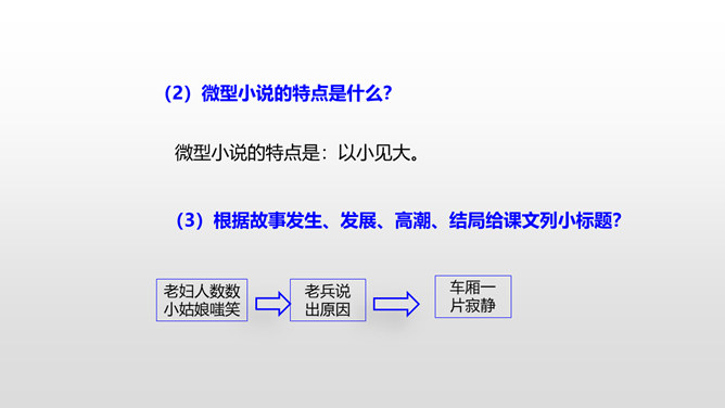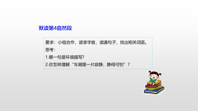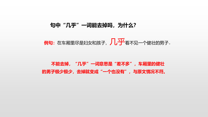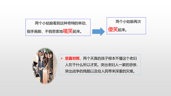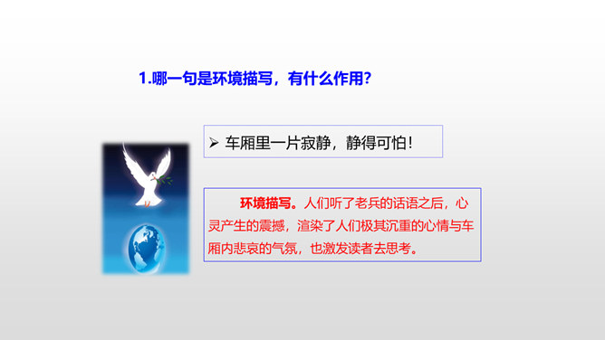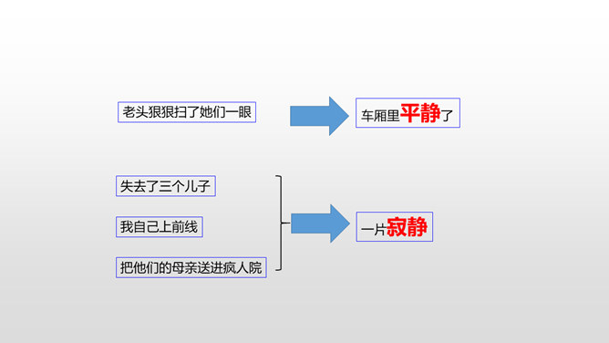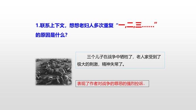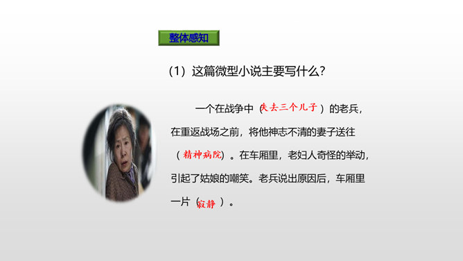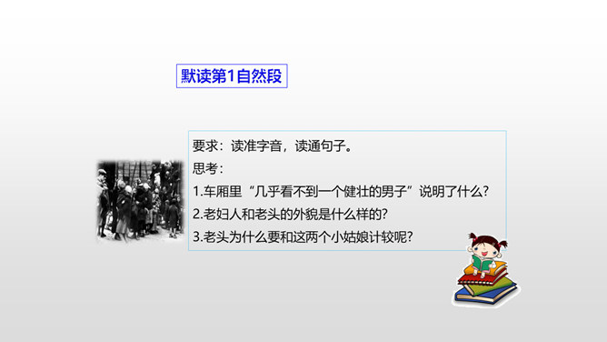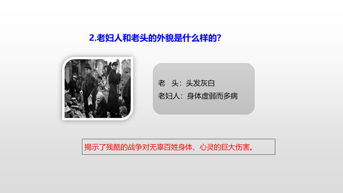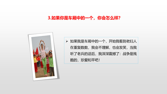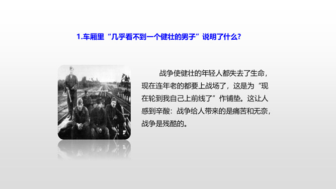 思考:1.车厢里“几乎看不到一个健壮的男子”说明了什么?2.老妇人和老头的外貌是什么样的?3.老头为什么要和这两个小姑娘计较呢?车厢里“几乎看不到一个健壮的男子”说明了什么?战争使健壮的年轻人都失去了生命,现在连年老的都要上战场了,这是为“现在轮到我自己上前线了”作铺垫。这让人感到辛酸:战争给人带来的是痛苦和无奈,战争是残酷的。老妇人和老头的外貌是什么样的?揭示了残酷的战争对无辜百姓身体、心灵的巨大伤害。所属专题:在柏林ppt。