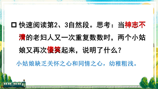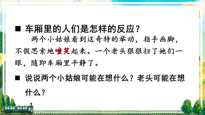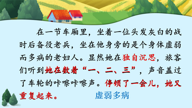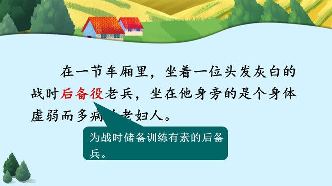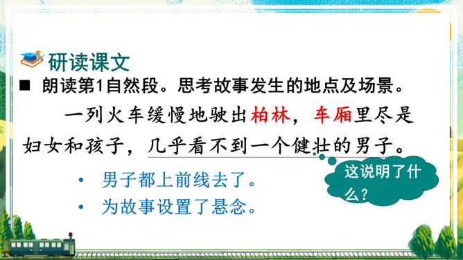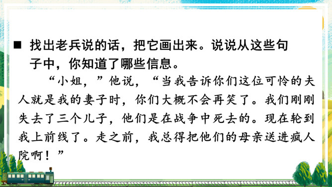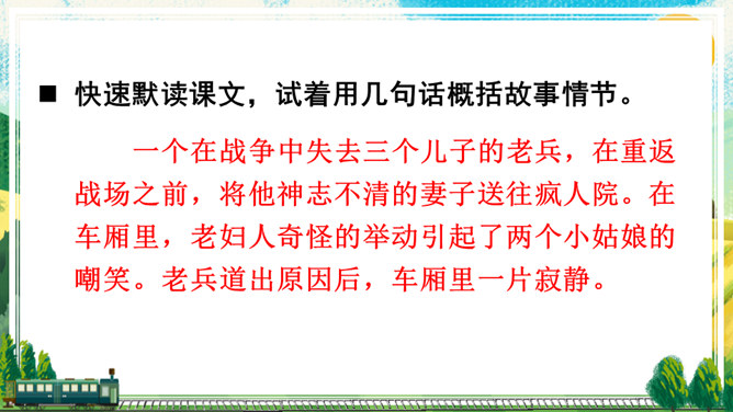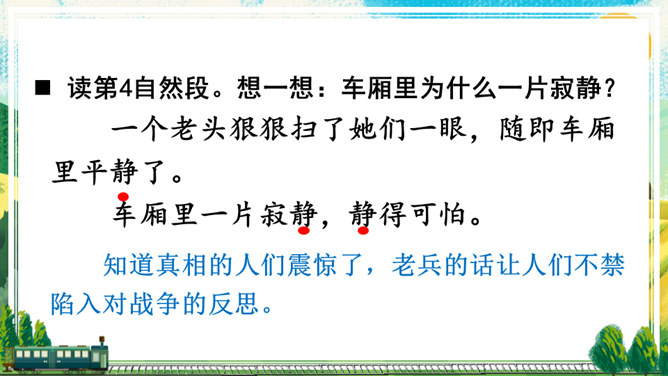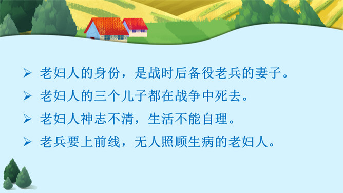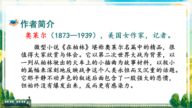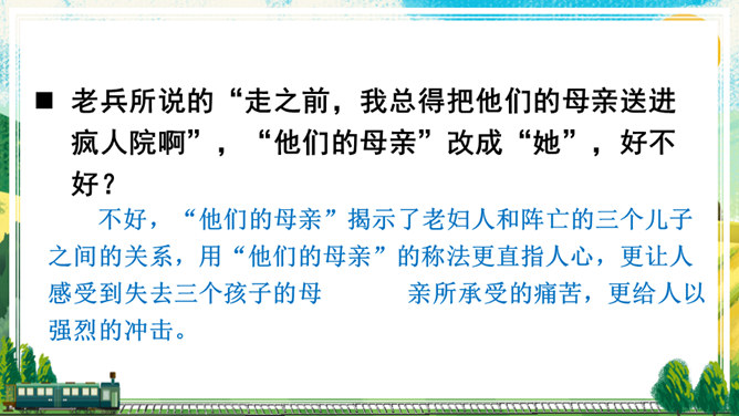 柏林是这场战争的策源地。作者将文章的背景置于这列由柏林开出的列车上,可以想见,遭受到残酷战争的不仅仅是列车上后备役老兵这一家。老妇人由痛心到绝望到疯狂的心路历程,后备役老兵抛家弃妻的无奈和难以言说的巨大痛苦……这是战争中一个家庭的毁灭,更是千万个笼罩于战争阴影下的家庭的缩影。本文短小精悍,在人物对话上,文中唯一的对话是谜底,它一语中的地道破了事实的真相。所属专题:在柏林ppt。