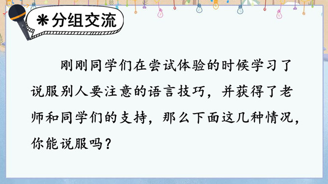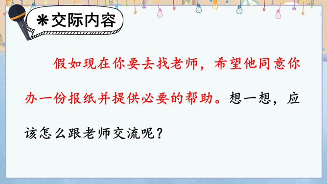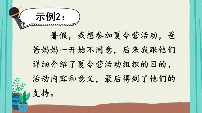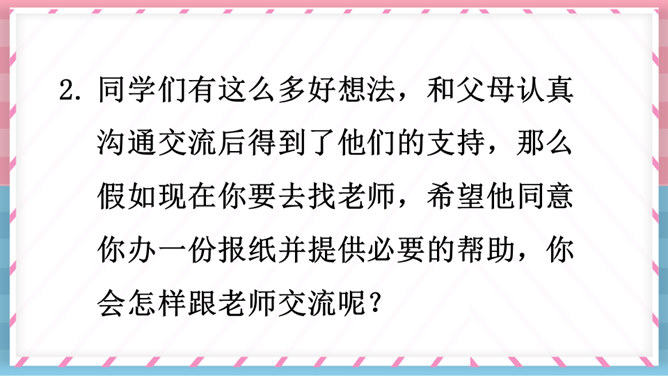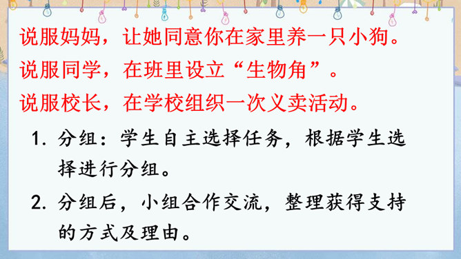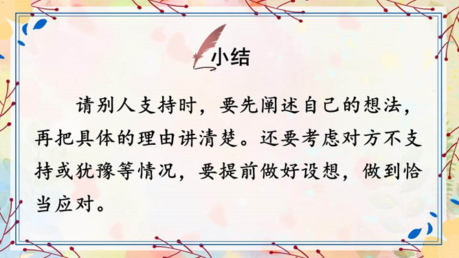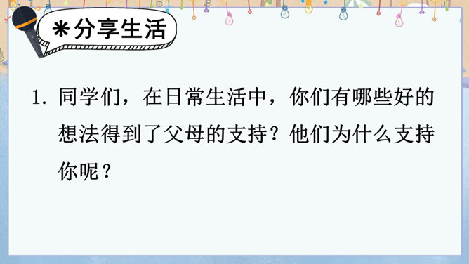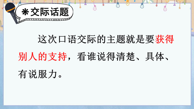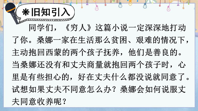 同学们,《穷人》这篇小说一定深深地打动了你。桑娜一家在生活那么贫困、艰难的情况下,主动抱回西蒙的两个孩子抚养,他们是善良的。当桑娜还没有和丈夫商量就抱回两个孩子时,心里是有些担心的,好在丈夫什么都没说就同意了。试想如果丈夫不同意怎么办?桑娜会如何说服丈夫同意收养呢?这次口语交际的主题就是要获得别人的支持,看谁说得清楚、具体、有说服力。同学们,在日常生活中,你们有哪些好的想法得到了父母的支持?所属专题:请你支持我ppt。