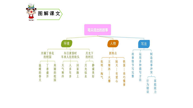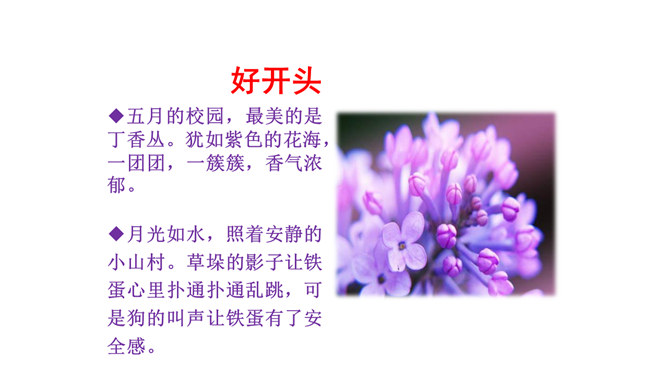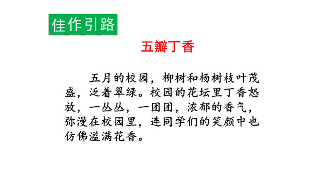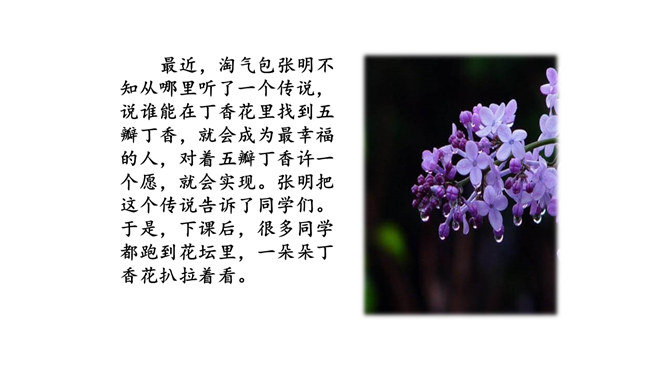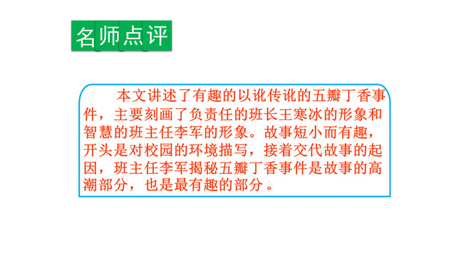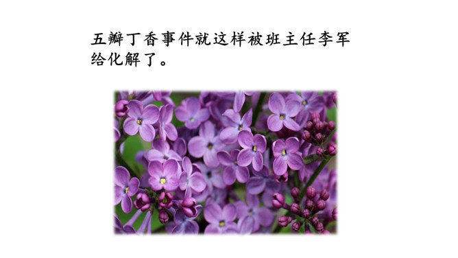 创编故事时,注意围绕主要人物展开;把故事写完整,情节尽可能吸引人;试着写清楚故事发生的环境,抓住人物的语言、动作及心理活动,力求将故事写得具体生动。本文讲述了有趣的以讹传讹的五瓣丁香事件,主要刻画了负责任的班长王寒冰的形象和智慧的班主任李军的形象。故事短小而有趣,开头是对校园的环境描写,接着交代故事的起因,班主任李军揭秘五瓣丁香事件是故事的高潮部分,也是最有趣的部分 。所属专题:笔尖流出的故事ppt。