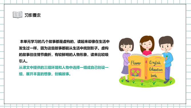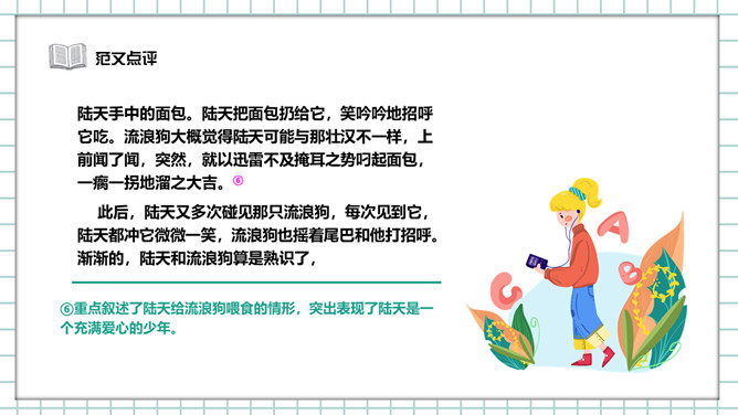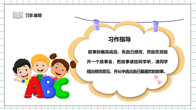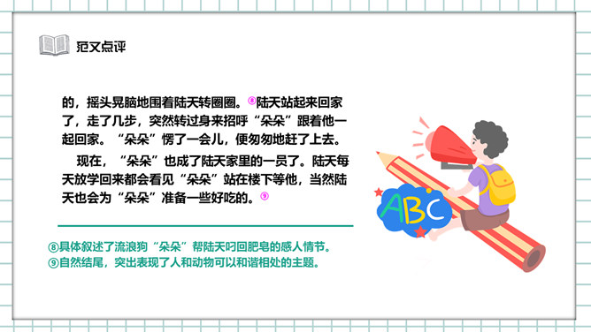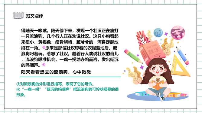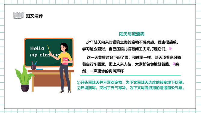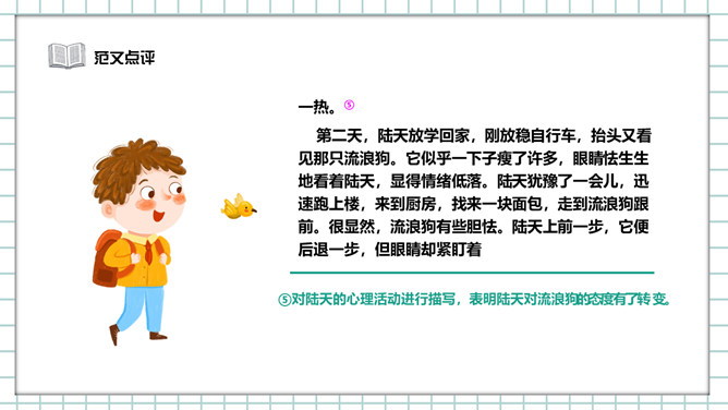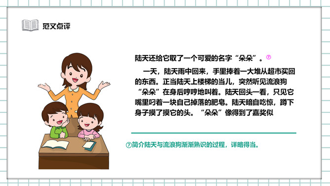 故事创编完成后,先自己修改,然后在班级开一个故事会,把故事读给同学听,请同学提出修改意见,并从中选出自己最喜欢的故事。①开头写陆天并不喜欢宠物,为下文写陆天态度的转变埋下伏笔。②环境描写,突出了天气寒冷,为下文写流浪狗的遭遇渲染气氛。③对流浪狗的外形进行描写,表现了它的可怜。④“一瘸一拐”“低沉的呜咽声”把流浪狗的可怜状描摹的很形象。⑤对陆天的心理活动进行描写,表明陆天对流浪狗的态度有了转变。所属专题:笔尖流出的故事ppt。